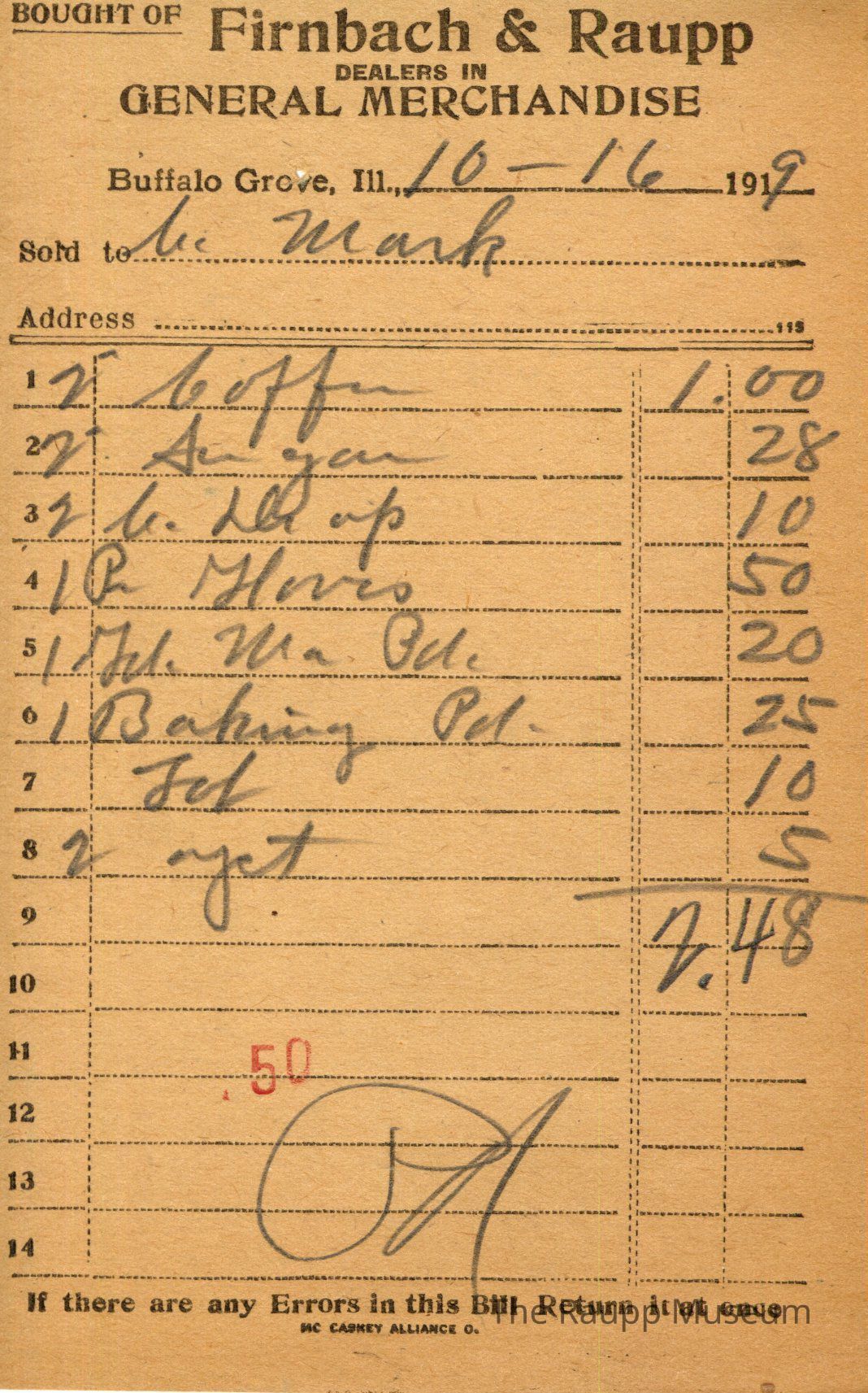 One (1) Firnbach and Raupp store receipt from October 16, 1919. Receipt is rectangular with black printed text and written notes in pencil. The receipt is for C. Mark (?), who bought two pounds of coffee for $1.00, two pounds of sugar for $0.28, two b. wrap (?) for $0.10, one pair of gloves for $0.50, one Gd. Ma. Pd. for $0.20, one baking powder for $0.25, tol (?) for $0.10, and two yeast for $0.05. The total is $2.48 and the receipt is marked as paid. A red stamp of 50 is located towards the bottom of the page. The text from top to bottom is: BOUGHT OF Firnbach & Raupp; DEALERS IN GENERAL MERCHANDISE; Buffalo Grove, Ill.; Sold to; Address; If there are any Errors in this Bill Return It at once; MC CASKEY ALLIANCE O.Archive Details