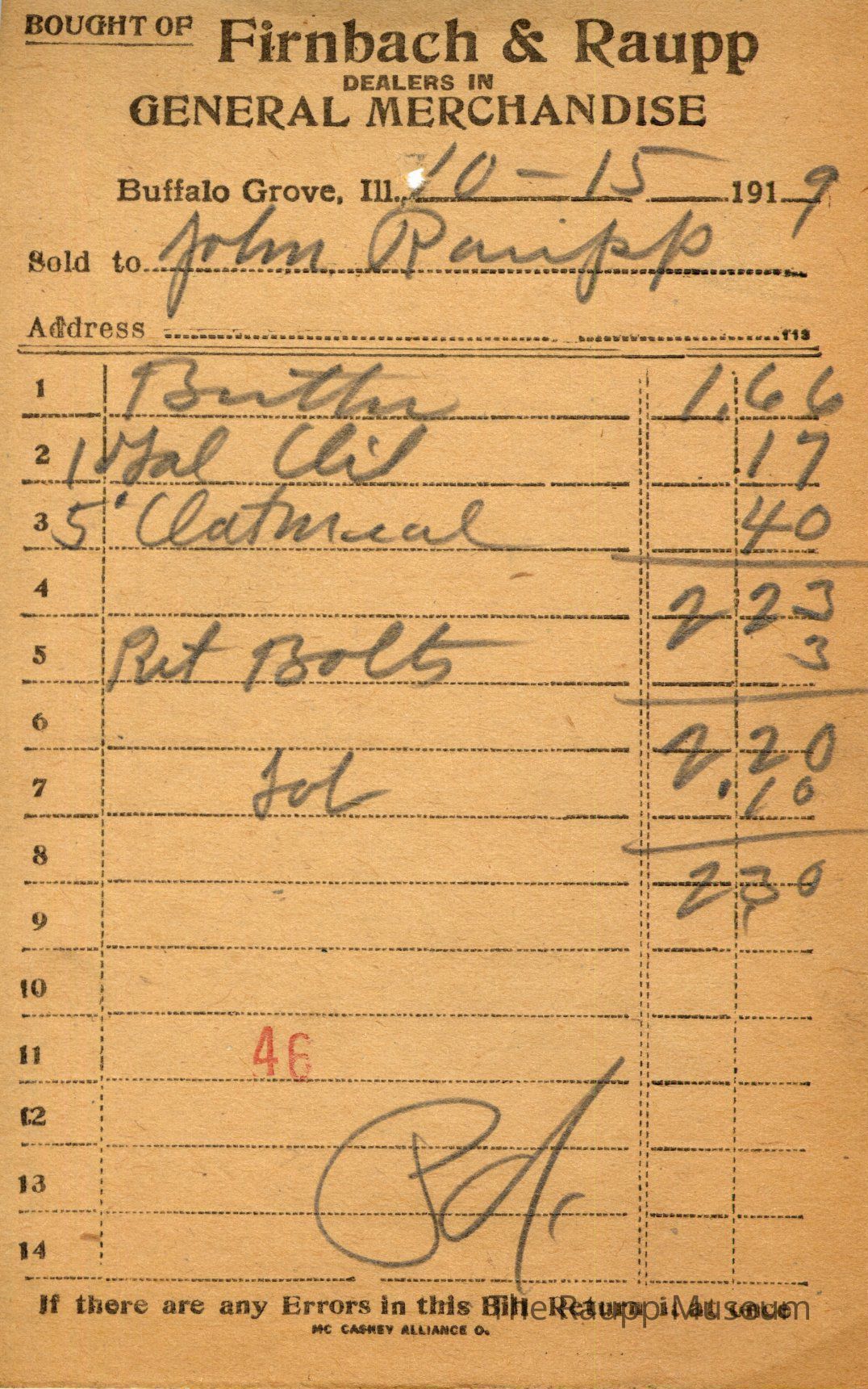 One (1) Firnbach and Raupp store receipt from October 15, 1919. Receipt is rectangular with black printed text and written notes in pencil. The receipt is for John Raupp, who bought butter for $1.66, one gallon of oil for $0.17, five pounds of oatmeal for $0.40, and tol (?) for $0.10. Three cents were deducted for "rit bolt" (?). The total is $2.30 and the receipt is marked as paid. A red stamp of 46 is located towards the bottom of the page. The text from top to bottom is: BOUGHT OF Firnbach & Raupp; DEALERS IN GENERAL MERCHANDISE; Buffalo Grove, Ill.; Sold to; Address; If there are any Errors in this Bill Return It at once; MC CASKEY ALLIANCE O.Archive Details