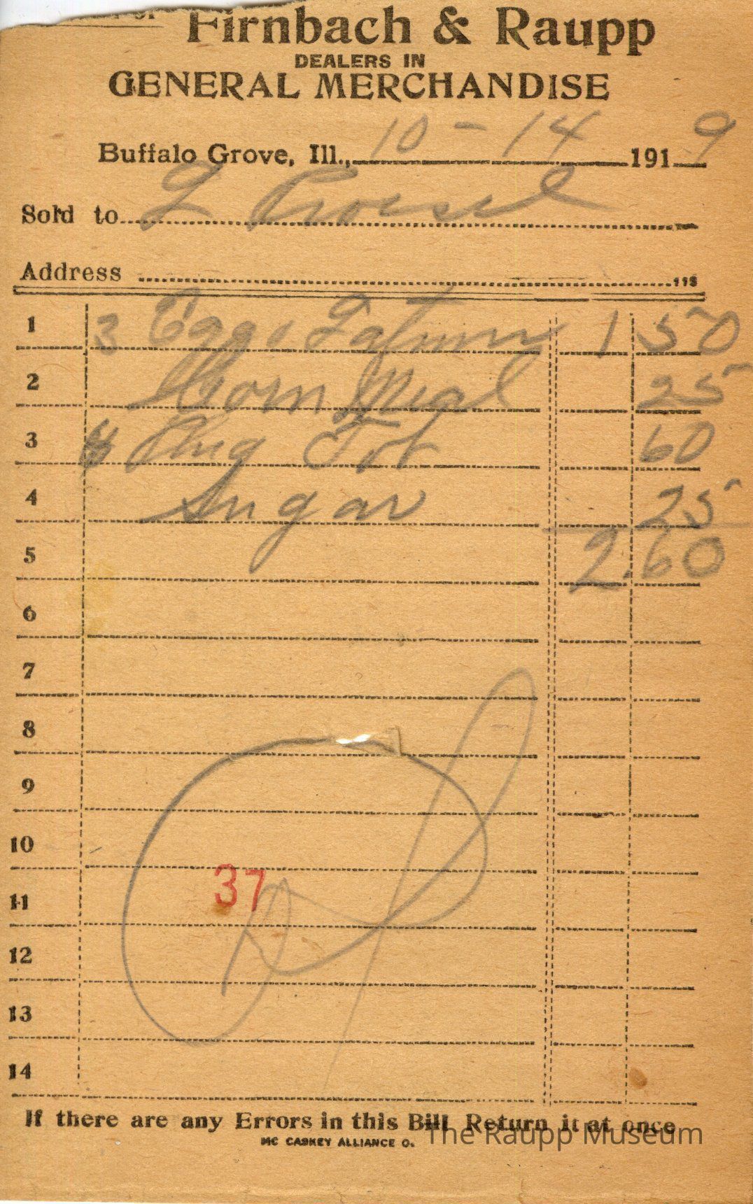 One (1) Firnbach and Raupp store receipt from October 14, 1919. Receipt is rectangular with black printed text and written notes in pencil. The receipt is for G. Procsel (?), who bought three egg & gatmen (?) for $1.50, cornmeal for $0.25, four plug job (?) for $0.60, and sugar for $0.25. The total is $2.60 and the receipt is marked as paid. A red stamp of 37 is located towards the bottom of the page. The text from top to bottom is: BOUGHT OF Firnbach & Raupp; DEALERS IN GENERAL MERCHANDISE; Buffalo Grove, Ill.; Sold to; Address; If there are any Errors in this Bill Return It at once; MC CASKEY ALLIANCE O.Archive Details