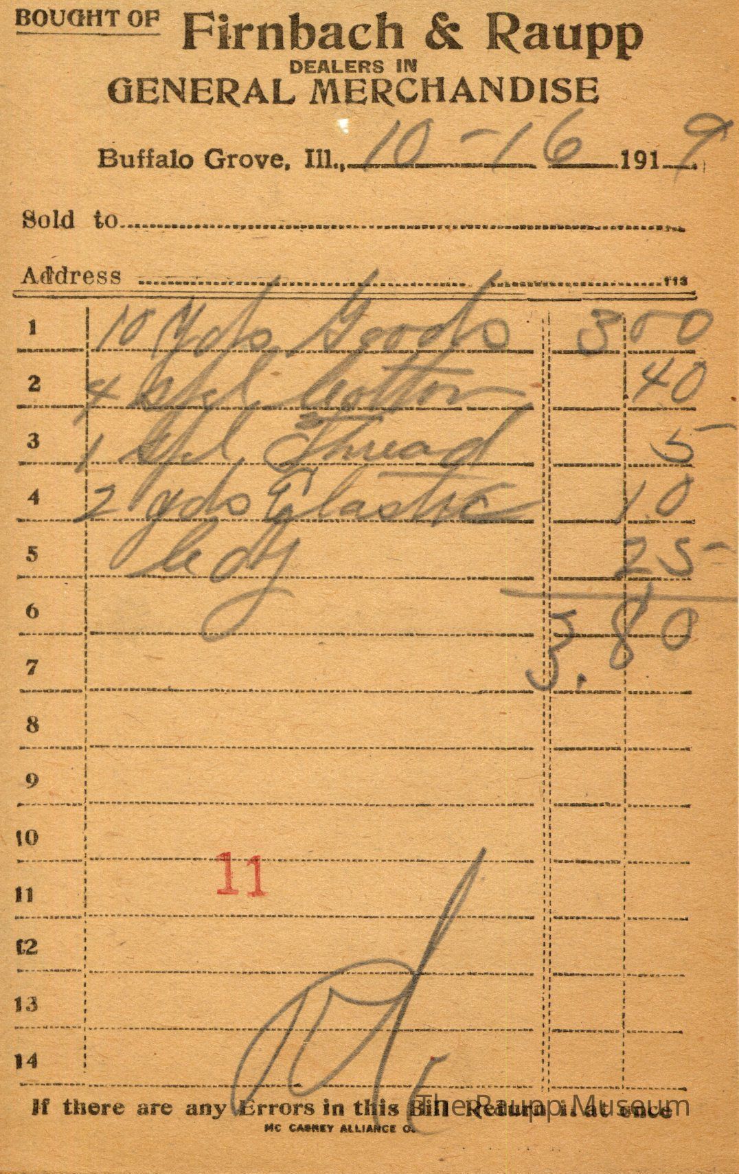 One (1) Firnbach and Raupp store receipt from October 16, 1919. Receipt is rectangular with black printed text and written notes in pencil. The receipt is for an unknown customer, who bought ten yards of goods (?) for $3.00, four spl button (?) for $0.40, one spl thread for $0.05, two yards of elastic for $0.10, and b. dy (?) for $0.25. The total is $3.80 and the receipt is marked as paid. A red stamp of 11 is located towards the bottom of the page. The text from top to bottom is: BOUGHT OF Firnbach & Raupp; DEALERS IN GENERAL MERCHANDISE; Buffalo Grove, Ill.; Sold to; Address; If there are any Errors in this Bill Return It at once; MC CASKEY ALLIANCE O.Archive Details