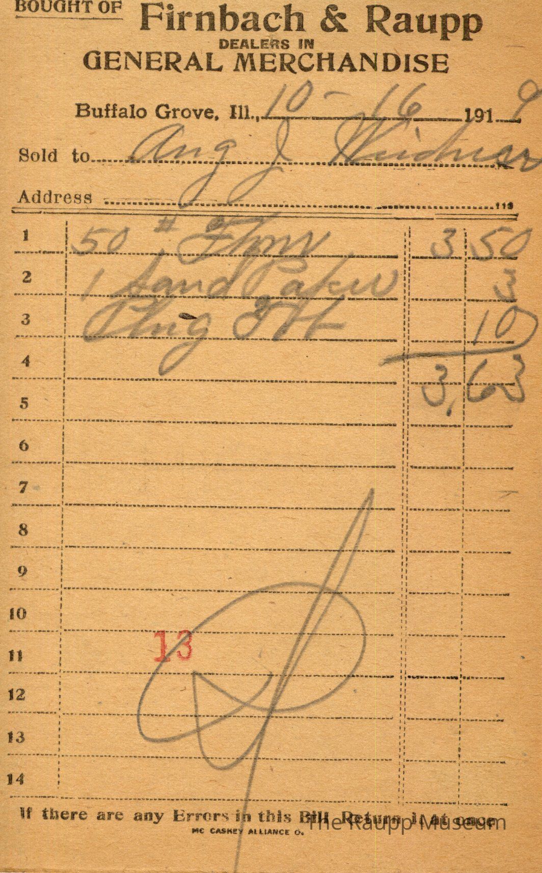 One (1) Firnbach and Raupp store receipt from October 16, 1919. Receipt is rectangular with black printed text and written notes in pencil. The receipt is for Ang. J. Weidner, who bought fifty pounds of flum (?) for $3.50, one sand paper for $0.03, and plug job (?) for $0.10. The total is $3.63 and the receipt is marked as paid. A red stamp of 13 is located towards the bottom of the page. The text from top to bottom is: BOUGHT OF Firnbach & Raupp; DEALERS IN GENERAL MERCHANDISE; Buffalo Grove, Ill.; Sold to; Address; If there are any Errors in this Bill Return It at once; MC CASKEY ALLIANCE O.Archive Details