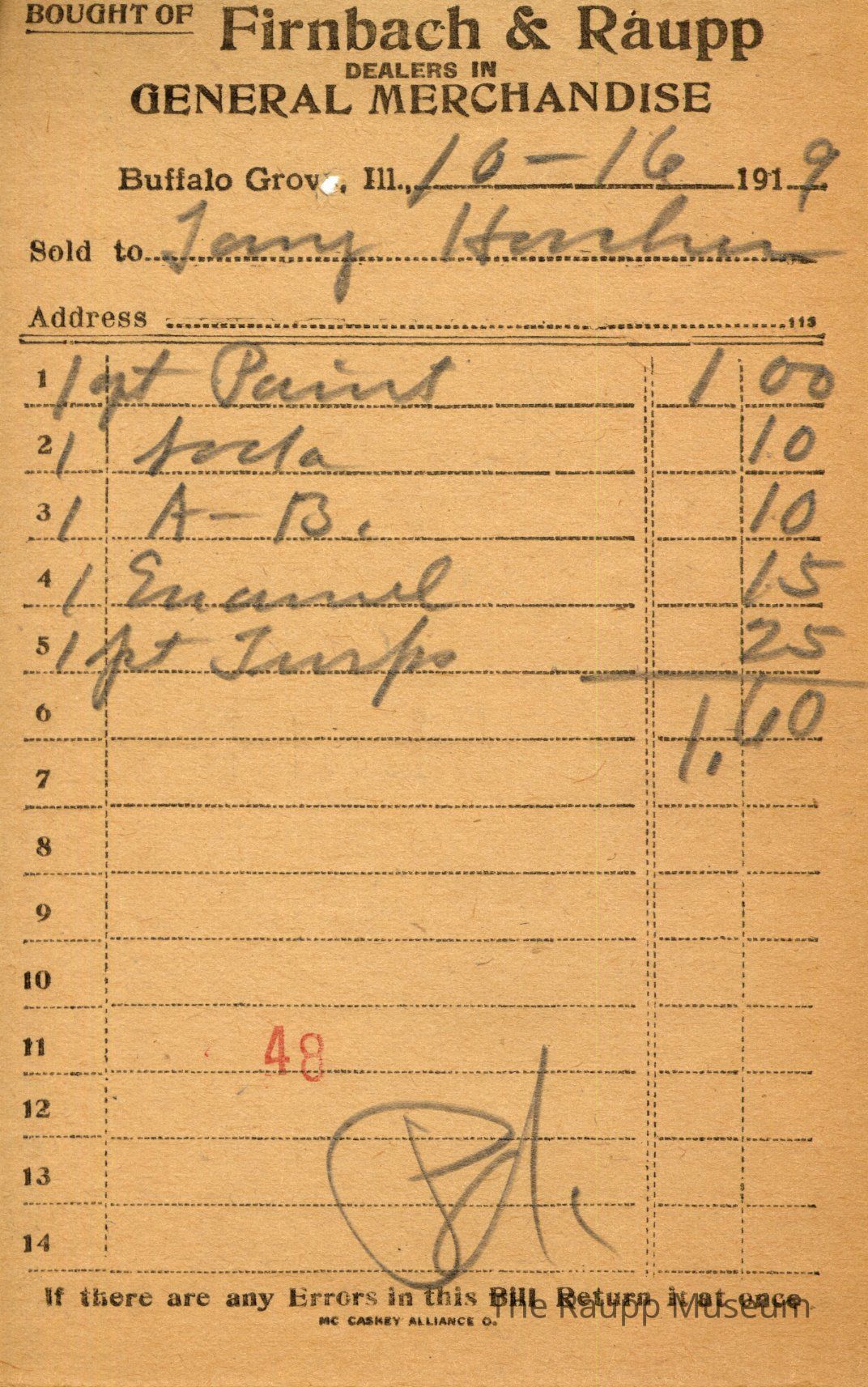 One (1) Firnbach and Raupp store receipt from October 16, 1919. Receipt is rectangular with black printed text and written notes in pencil. The receipt is for Tony Horcher, who bought one quart of paint for $1.00, one soda for $0.10, one A-B for $0.10, one enamel for $0.15, and one pint of turp (?) for $0.25. The total is $1.60 and the receipt is marked as paid. A red stamp of 48 is located towards the bottom of the page. The text from top to bottom is: BOUGHT OF Firnbach & Raupp; DEALERS IN GENERAL MERCHANDISE; Buffalo Grove, Ill.; Sold to; Address; If there are any Errors in this Bill Return It at once; MC CASKEY ALLIANCE O.Archive Details