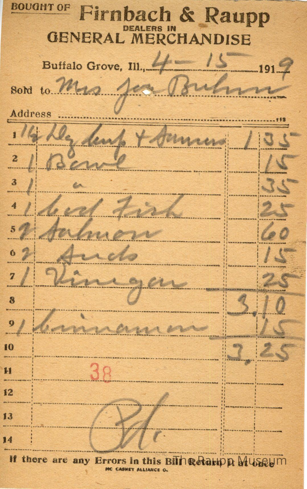 One (1) Firnbach and Raupp store reciept from April 15, 1919. Receipt is rectangular with black printed text and written notes in pencil. The receipt is for Mrs. Joe(?) Brehm, who bought 1/2 dz (?) for $1.35, 1 bowl for $0.15, 1 bowl for $0.35, 1 cod fish for $0.25, 2 salmon for $0.50, 2 seeds for $0.15, 1 vinegar for $0.25, and 1 cinnamon for $0.15. Bill total is $3.25. There's a red "38" stamp at the bottom with the bill marked as paid.