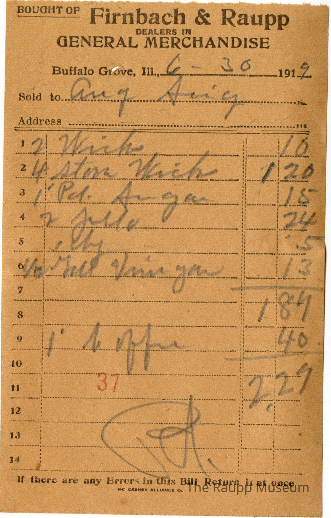 One (1) Firnbach and Raupp store receipt from June 30, 1919. Receipt is rectangular with black printed text and written notes in pencil. The receipt is for Aug Seig, who bought two wicks for $0.10, four stove wicks for $1.20, one pound of sugar for $0.15, two jello for $0.24, (?) for $0.05, 1/2 gallon of vinegar for $0.13. Bill total of $1.87. Then, an addition of one pound of coffee for $0.40. New bill total of $2.27.
