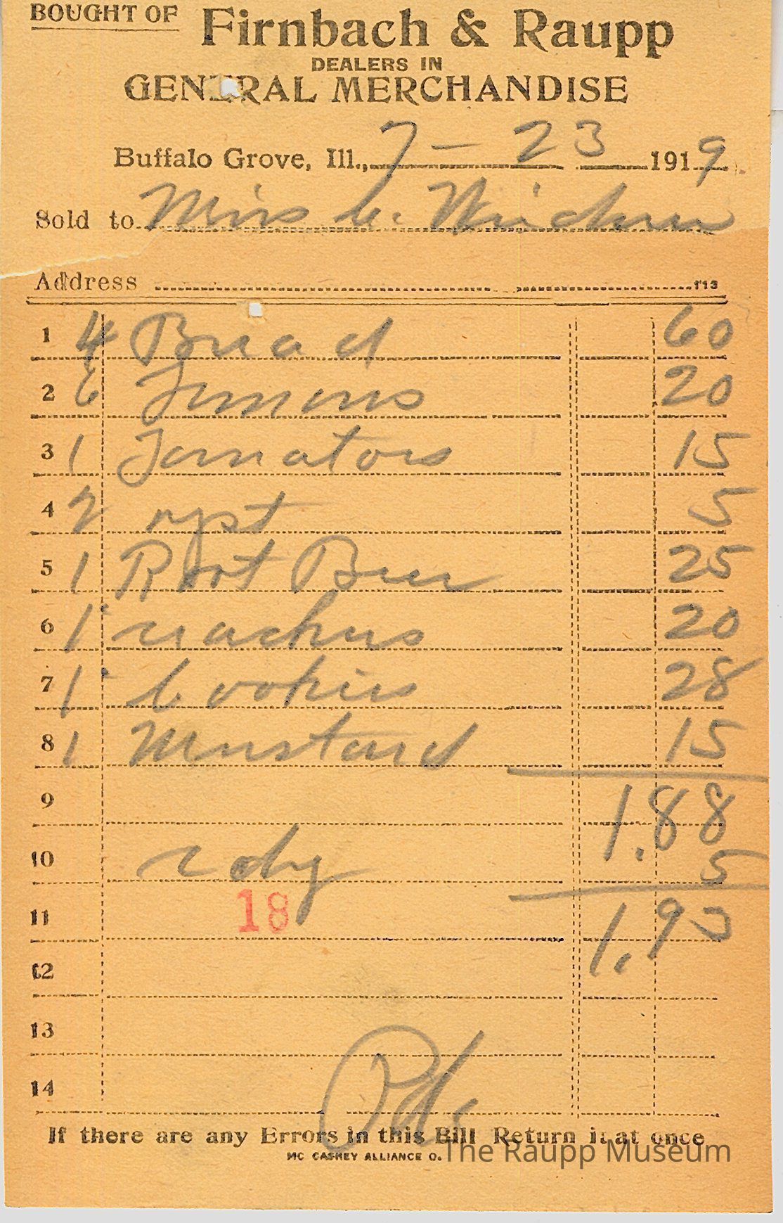 One (1) Firnbach and Raupp store receipt from July 23, 1919. Receipt is rectangular with black printed text and written notes in pencil.