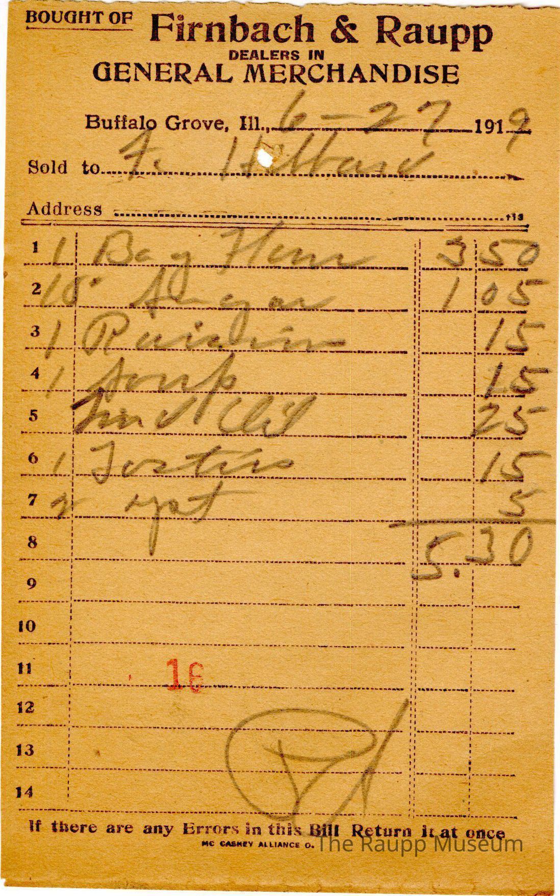 The black text is as follows, Bought of Firnbach and Raupp; Dealers in; General Merchandise; Buffalo Grove Ill.; Sold to; Address; If there are any Errors in this Bill Return it at once; MC CASKEY ALLIANCE O.