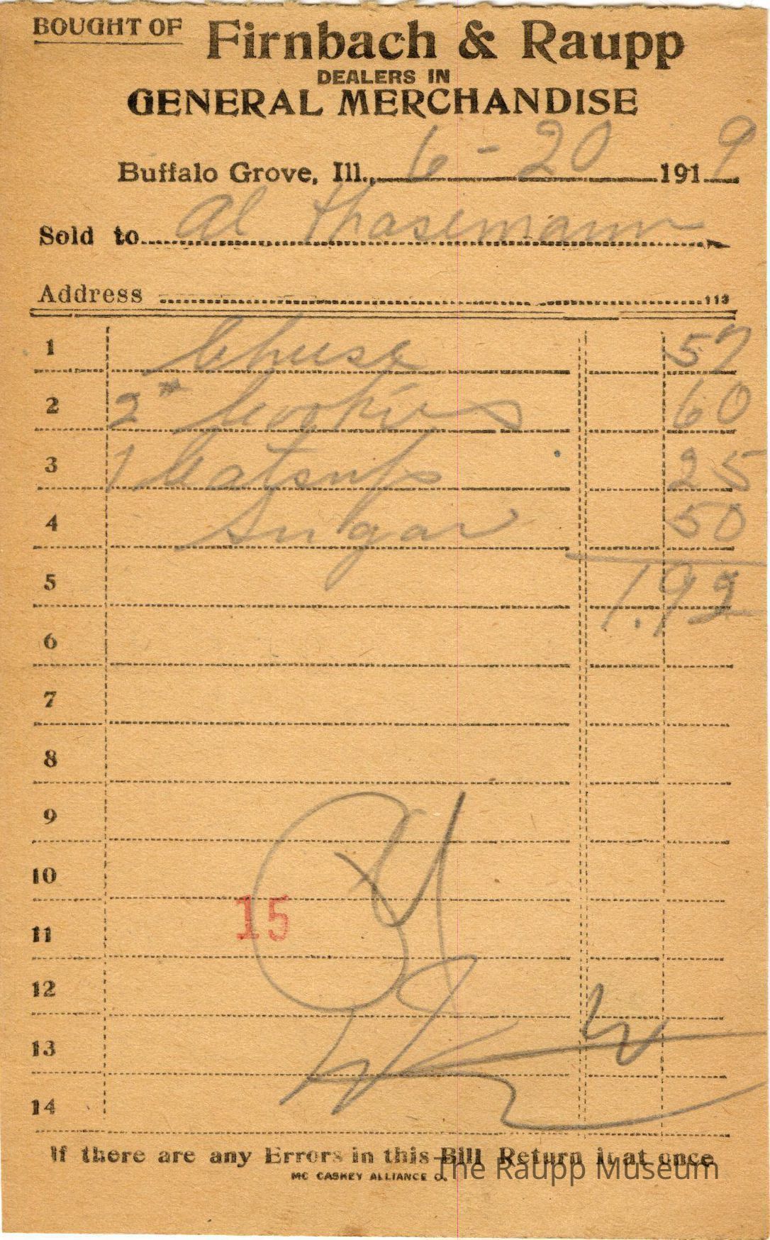 The black text is as follows, Bought of Firnbach and Raupp; Dealers in; General Merchandise; Buffalo Grove Ill.; Sold to; Address; If there are any Errors in this Bill Return it at once; MC CASKEY ALLIANCE O.