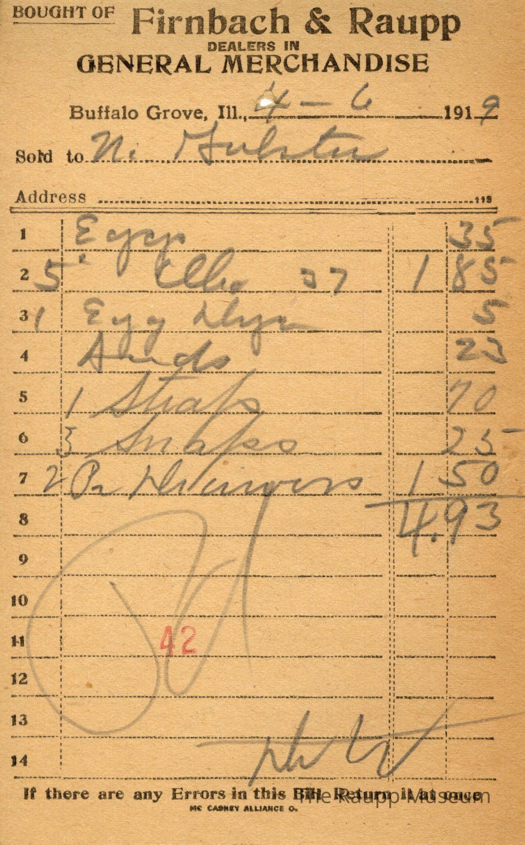 The black text is as follows, from top to bottom: Bought of Firnbach & Raupp; Dealers in GENERAL MERCHANDISE; Buffalo Grove, Ill.; Sold to; Address; if there are any Errors in this Bill Return it at once; MC CASKEY ALLIANCE O.Archive Details