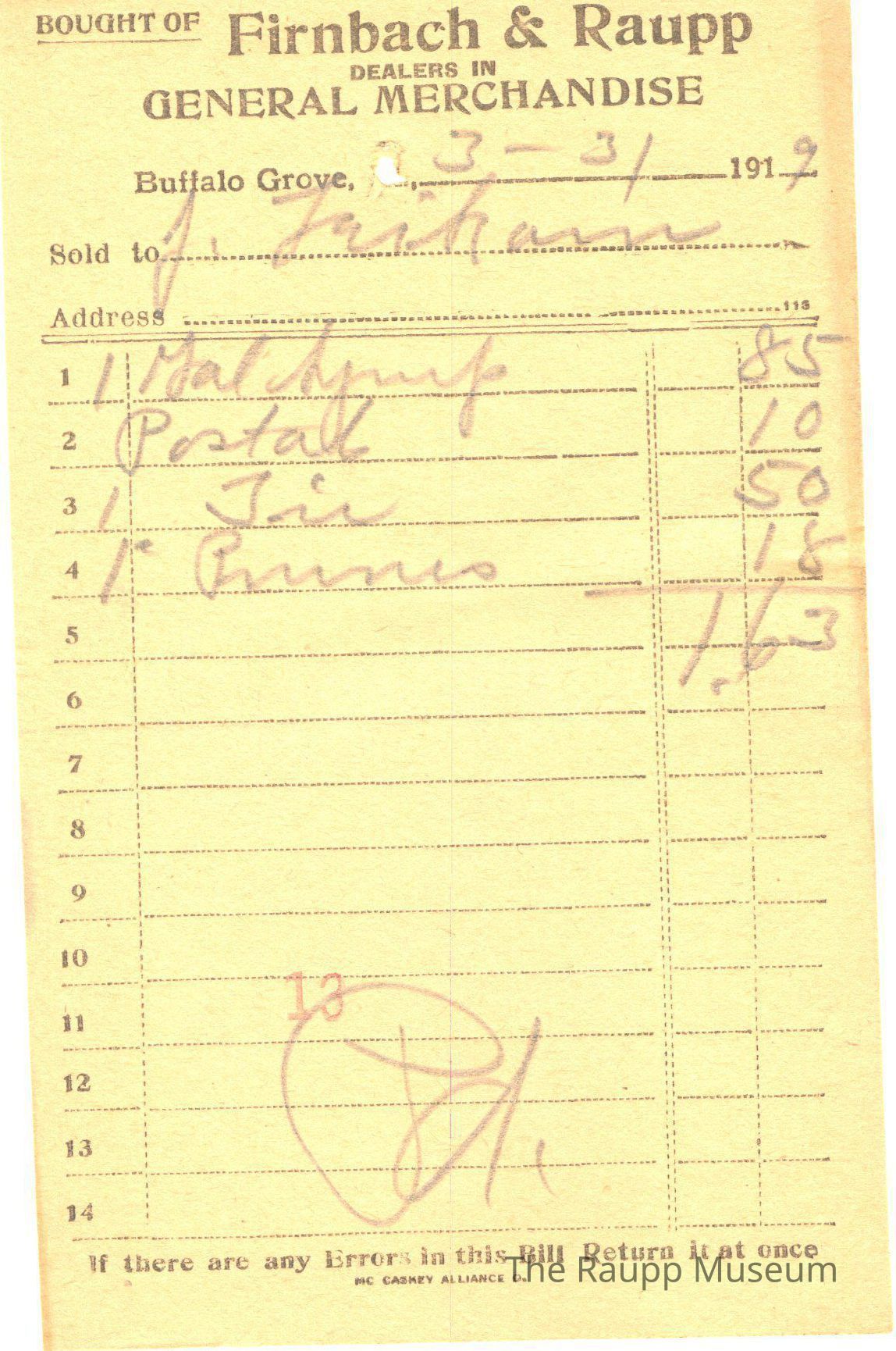 One (1) Firnbach & Raupp store receipt from March 31, 1919. The receipt is rectangular with black printed ink and handwritten notes in pencil. The receipt is for J. Leikam, who bought Gallon of Syrup for $0.85, Postal for $1.10, Tin (?) for $0.50, and prunes for $0.18. Bill total is $1.63. There is a red stamp of 13 close to the bottom, along with "Pd." to indicate that it was paid.