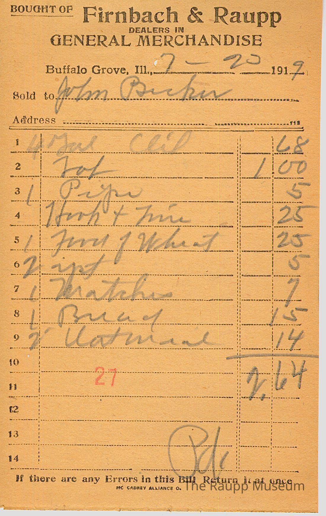 The black text is as follows, from top to bottom: Bought of Firnbach & Raupp; DEALERS IN; GENERAL MERCHANDISE; Buffalo Grove, Ill; Sold to; Address; If there are any Errors in this Bill, Return it at once; Mc Caskey Alliance CoArchive Details
