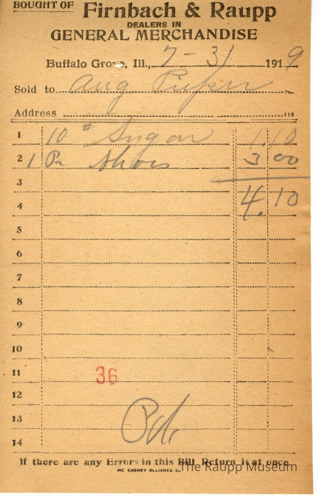 One (1) Firnbach and Raupp store receipt from July 31, 1919. Receipt is rectangular with black printed text and written notes in pencil. The receipt is for Aug Pirkin (?), who bought 10# sugar for for $1.10 and 1 pair of shoes for $3.00. The bill total is $4.10. There is a red stamp of "36" at the bottom with the bill marked as paid.