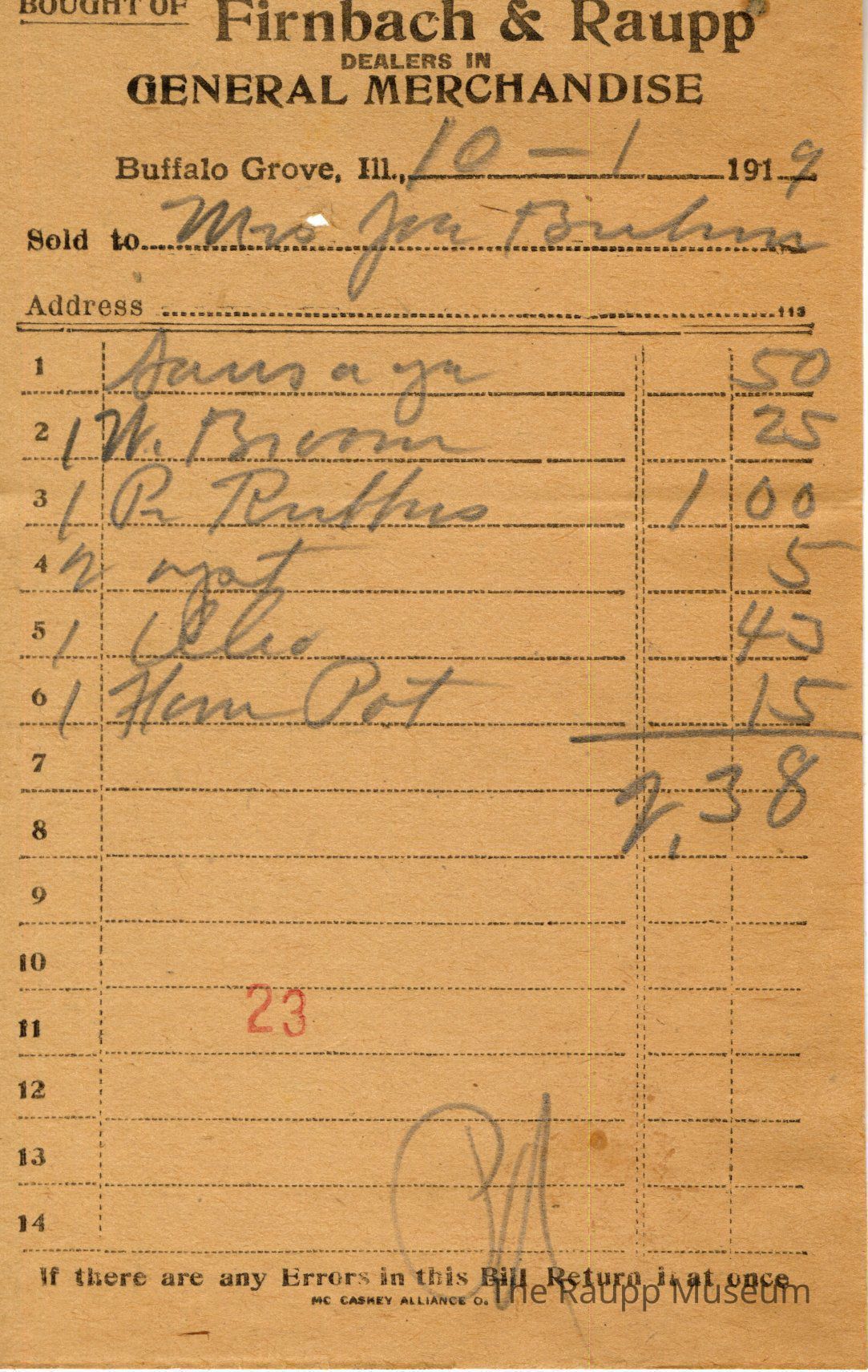 One (1) Firnbach and Raupp store receipt from October 1, 1919. Receipt is rectangular with black printed text and written notes in pencil. The receipt is for Mrs. Jen Brehms, who bought sausage for $0.50, one W. broom for $0.25, one pair of Ruffers for $1.00, two yeast for $0.05, one oleo for $0.43, and one ham pot (?) for $0.15. The bill total is $2.38 and the receipt is marked as paid. A red stamp of 23 is located towards the bottom of the page. The text from top to bottom is: BOUGHT OF Firnbach & Raupp; DEALERS IN GENERAL MERCHANDISE; Buffalo Grove, Ill.; Sold to; Address; If there are any Errors in this Bill Return It at once; MC CASKEY ALLIANCE O.Archive Details