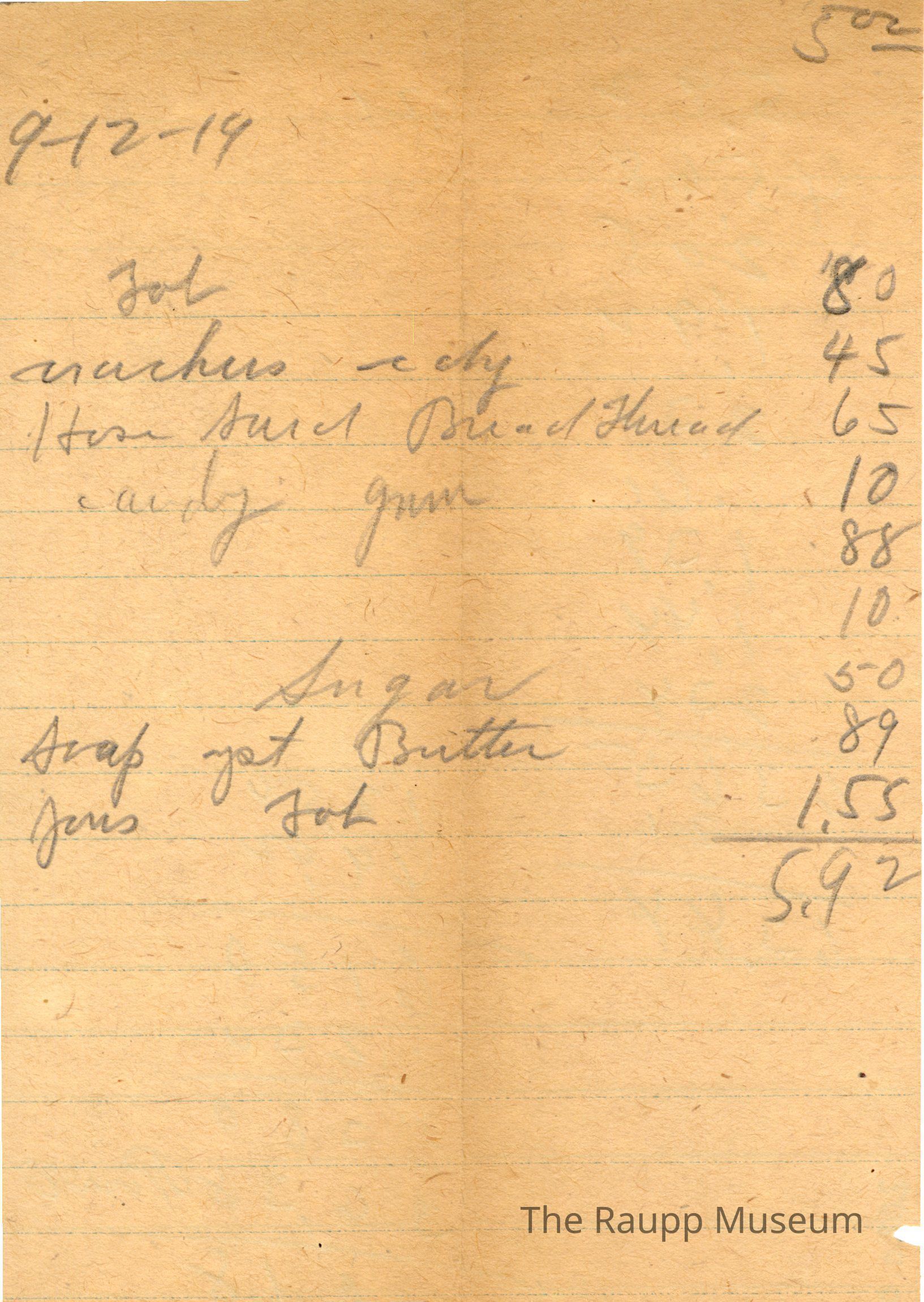One (1) Firnbach and Raupp store receipt from September 12, 1919. Receipt is rectangular with no printed text and written notes in pencil. The receipt is for an unknown customer, who bought tub for $0.80, crackers echy (?) for $0.45, hose sard bread thread for $0.65, candy gum for $0.10, sugar for $0.50, soap yst butter for $0.89, and jars tub for $1.55. The bill total appears to be $5.92. There are additional prices of $5.00, $0.88, and $0.10 on the receipt.Archive Details