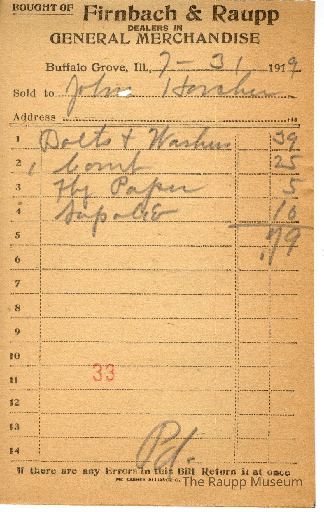 One (1) Firnbach and Raupp store receipt from July 31, 1919. Receipt is rectangular with black printed text and written notes in pencil. The receipt is for John Horcher, who bought bolts and washers $0.39, 1 comb $0.25, fly paper for $0.05 and (?) for $0.10. Bill total is $0.79. There is a red stamp of "33" at the bottom with the bill marked as paid.
