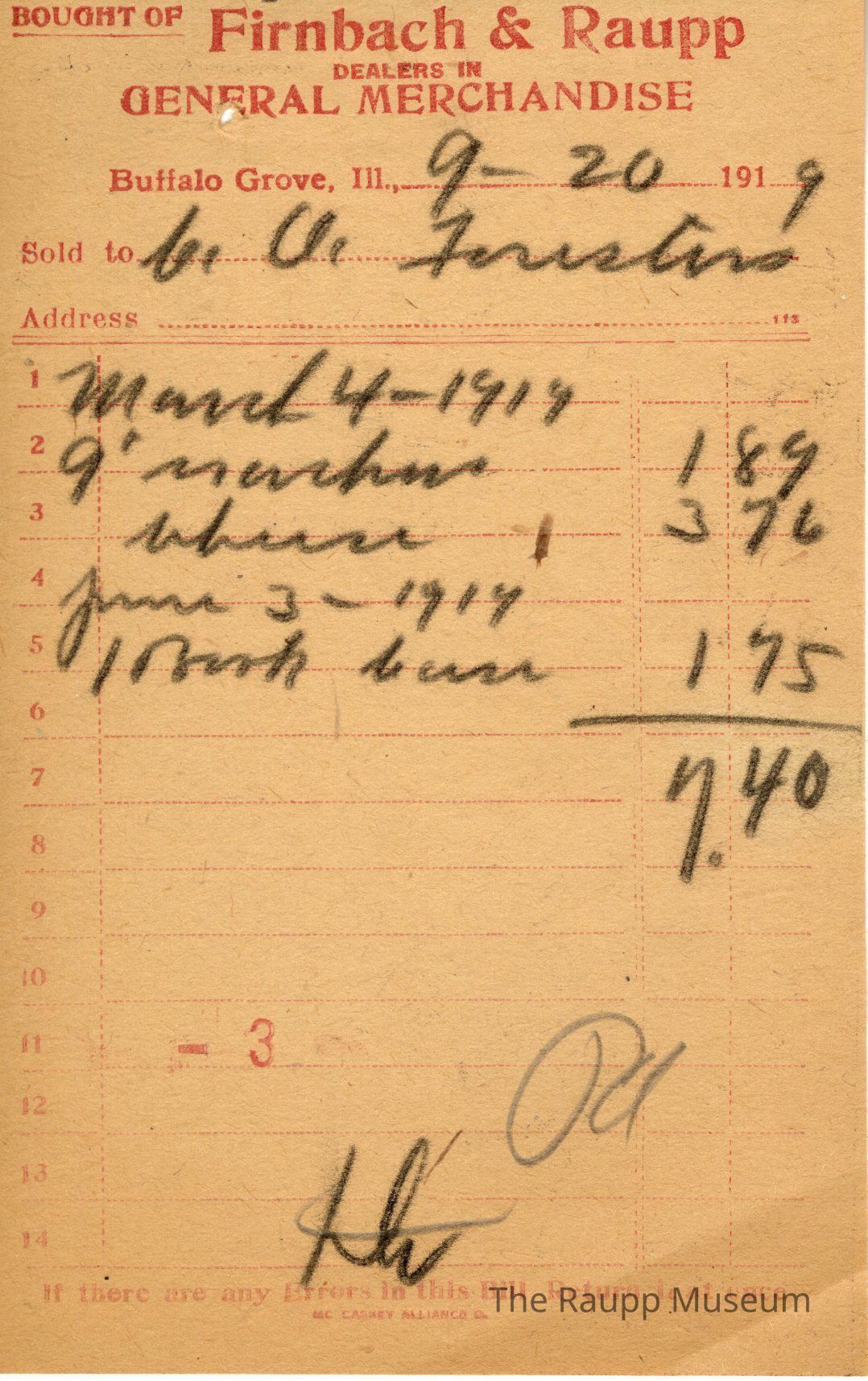 One (1) Firnbach and Raupp store receipt from September 20 1919. Receipt is for C. O. Forester (?), and is paying back a tab from March 4 1919 as well as June 3 1919. Purchased items on tab include nine (9) # crackers, one (1) cheese, and one (1) book case. Total is $7.40. Receipt is rectangular, with both printed and handwritten text. On the top is printed "Firnbach & Raupp Dealers In General Merchandise." PD is handwritten on the bottom, and a red number 3 is stamped on the center bottom. Multiple pencil markings are scattered across the bottom.Archive Details