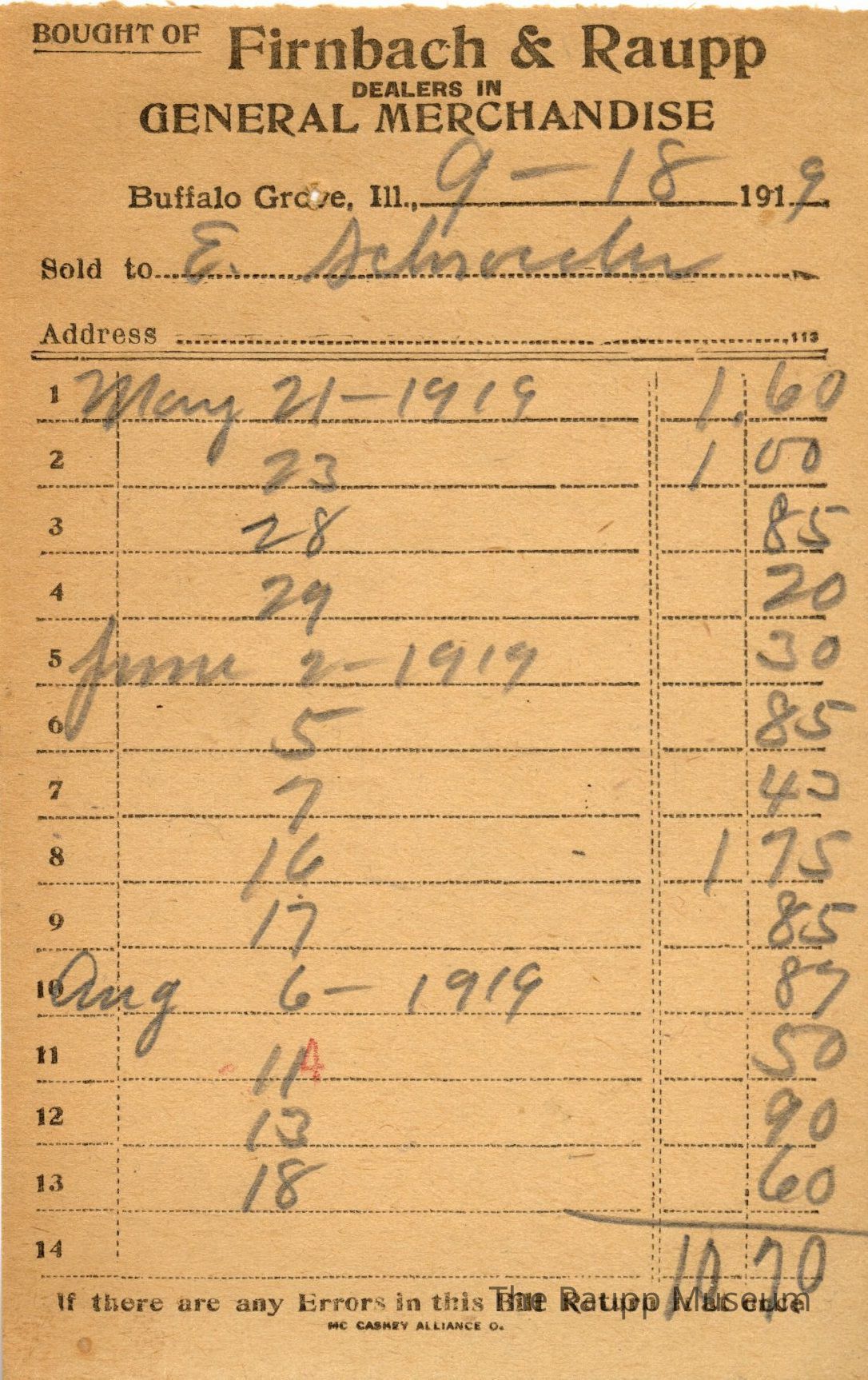 One (1) Firnbach and Raupp store receipt from September 18 1919. Receipt is for E. Schuarch (?), and is paying a tab from multiple days spanning May 21 to September 11, using two different receipts. Total was $10.90 on the first teceipt, $12.96 on the second. Receipt is rectangular, with both printed and handwritten text. On the top is printed "Firnbach & Raupp Dealers In General Merchandise." PD is handwritten on the bottom, and a red number 5 is stamped on the center bottom. Math markings are written across the back of the second receipt, which has a 2 circled on the top.Archive Details