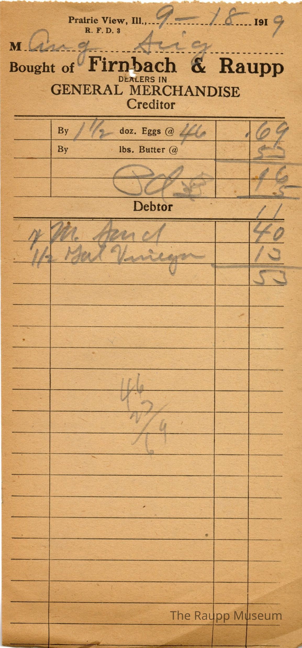 One (1) Firnbach and Raupp store receipt from September 18 1919. Receipt is for Ang Sieg, and has two (2) items bought, as well as one and a half (1 1/2) dozen eggs turned in at $.46 per dozen for a total of $.69. Purchased items include one (1) M. Sand (?) and one and one half (1 1/2) gal vinegar. Total was $.53. Receipt is rectangular, with both printed and handwritten text. On the top is printed "Firnbach & Raupp Dealers In General Merchandise." PD is handwritten on the top, and math markings are written in the center.Archive Details