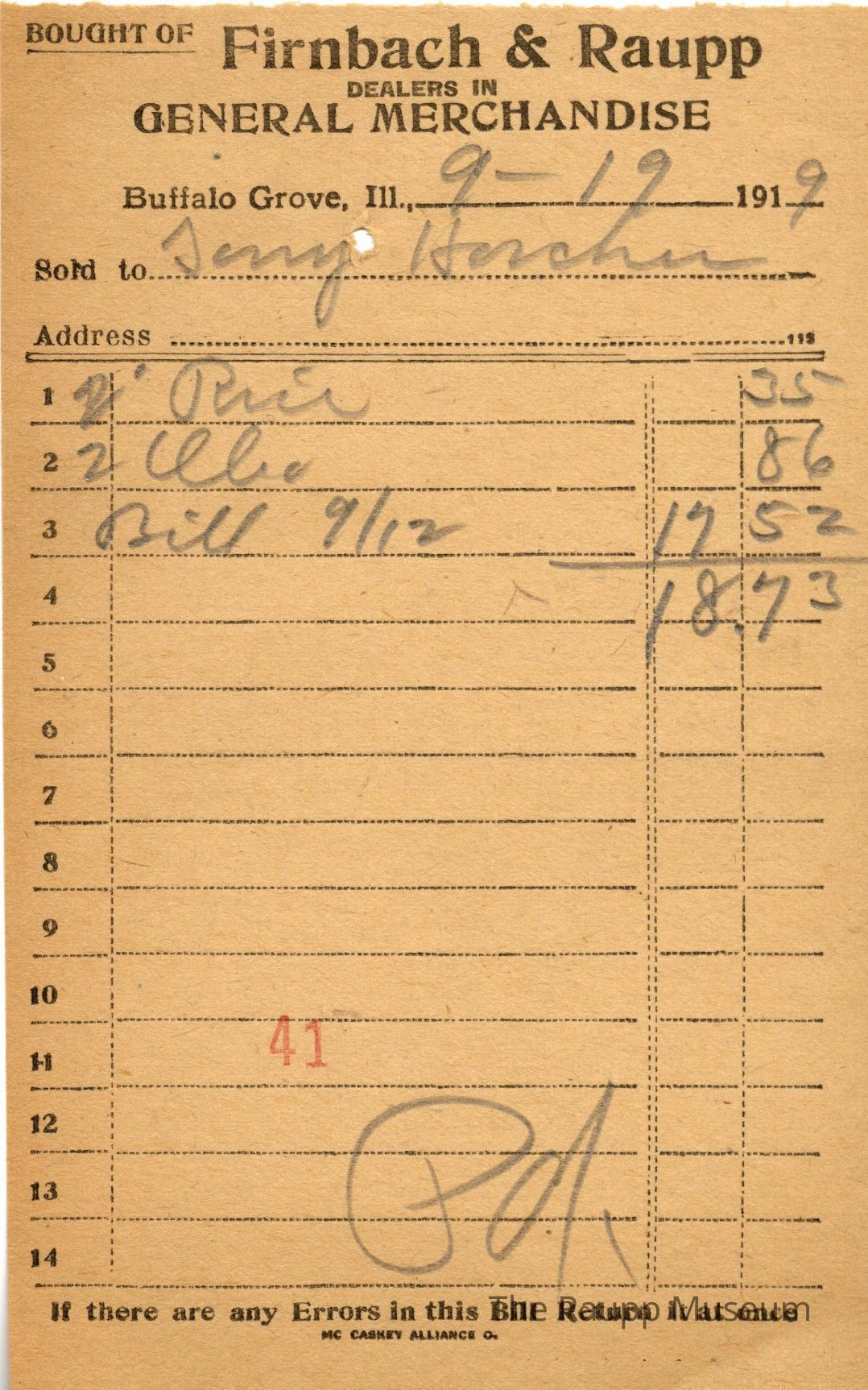 One (1) Firnbach and Raupp store receipt from September 19 1919. Receipt is for Tony Horcher, and has two (2) items purchased, as well as a bill paid from September 12 for $17.52. Purchased items include two (2) (?) and two (2) Oleo. Total was $18.73. Receipt is rectangular, with both printed and handwritten text. On the top is printed "Firnbach & Raupp Dealers In General Merchandise." PD is handwritten on the bottom, and a red number 41 is stamped on the center bottom.Archive Details