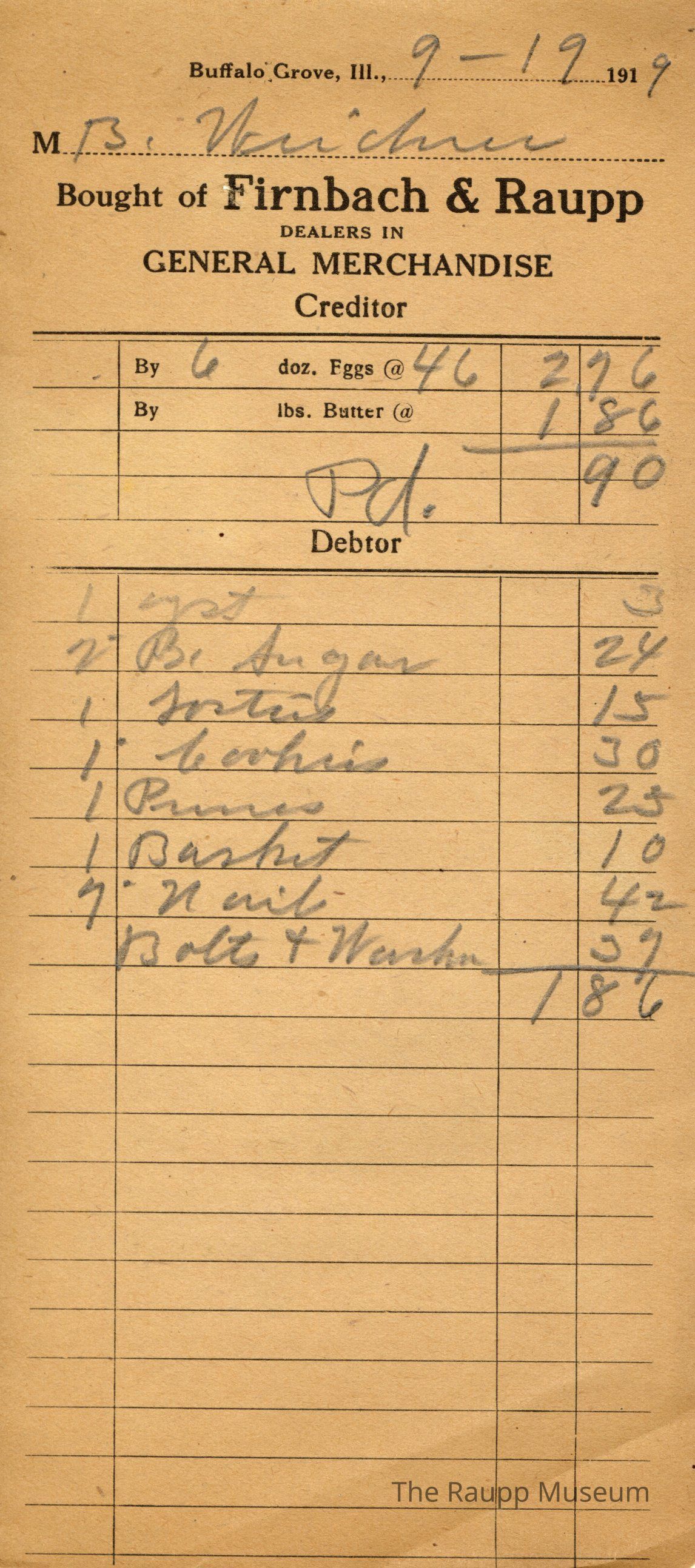 One (1) Firnbach and Raupp store receipt from September 19 1919. Receipt is for B. Weidner, and has eight (8) items purchased, as well as credit for six dozens of eggs at $.46 per dozen, totaling $2.96. Purchased items include one (1) yeast, two (2) B. Sugar, one (1) toasties, one (1) cookies, one (1) prunes, one (1) basket, nine (9) nails, and bolts and wrenches (?). Total was $1.86. Receipt is rectangular, with both printed and handwritten text. On the top is printed "Firnbach & Raupp Dealers In General Merchandise." PD is handwritten on the top.Archive Details