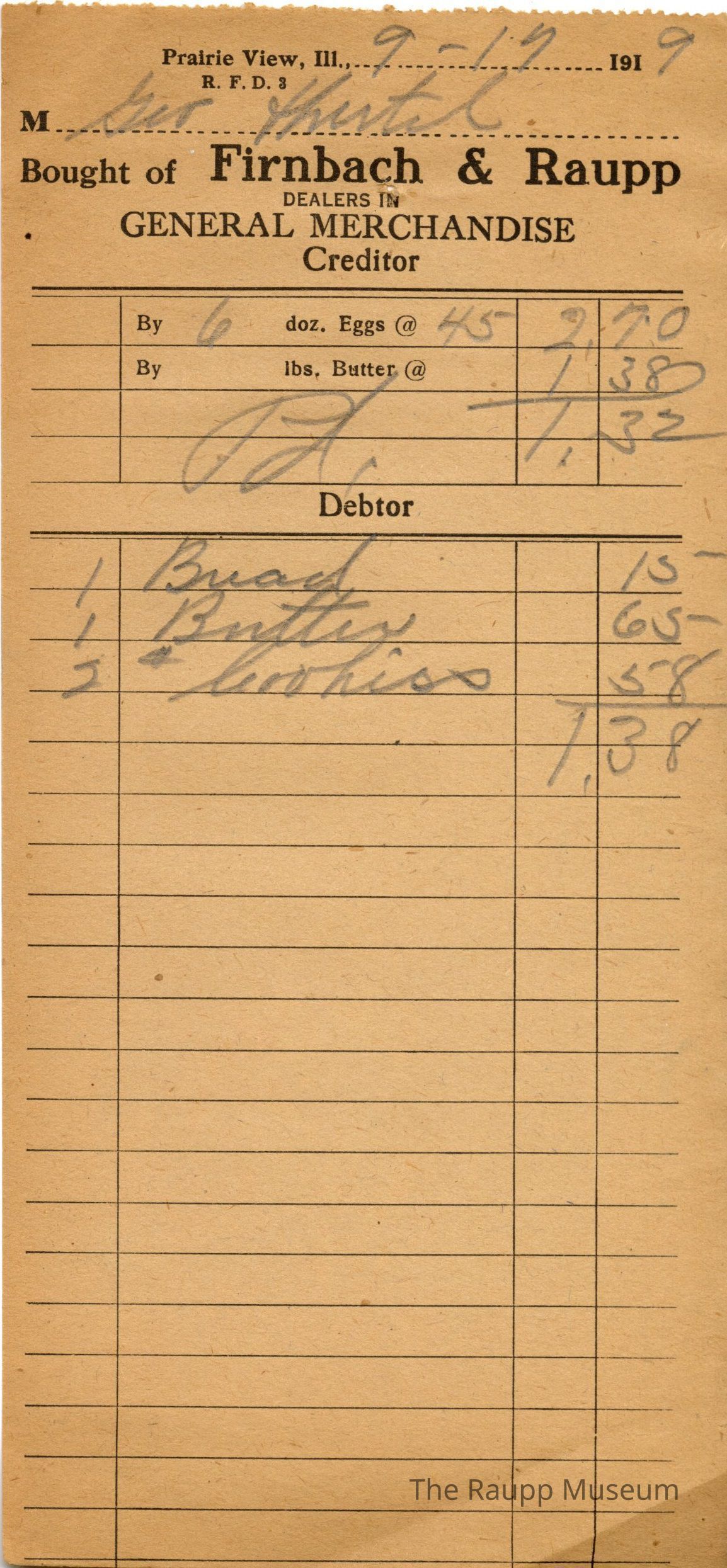 One (1) Firnbach and Raupp store receipt from September 17 1919. Receipt is for Geo Hertel, and has three (3) items purchased, as well as six (6) dozens of eggs given as credit at $.45 per dozen totaling $2.70. Purchased items include one (1) bread, one (1) butter, and two (2) # cookies. Total was $1.38. Receipt is rectangular, with both printed and handwritten text. On the top is printed "Firnbach & Raupp Dealers In General Merchandise." PD is handwritten on the top.Archive Details