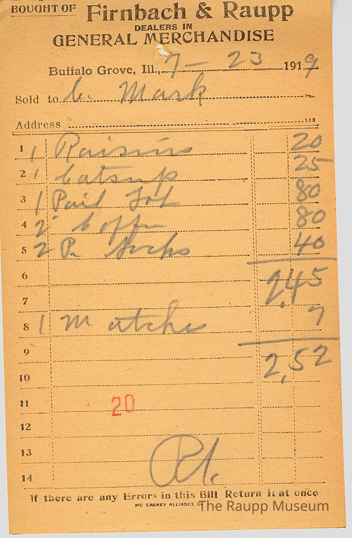 One (1) Firnbach and Raupp store receipt from July 23, 1919. Receipt is rectangular with black printed text and written notes in pencil.