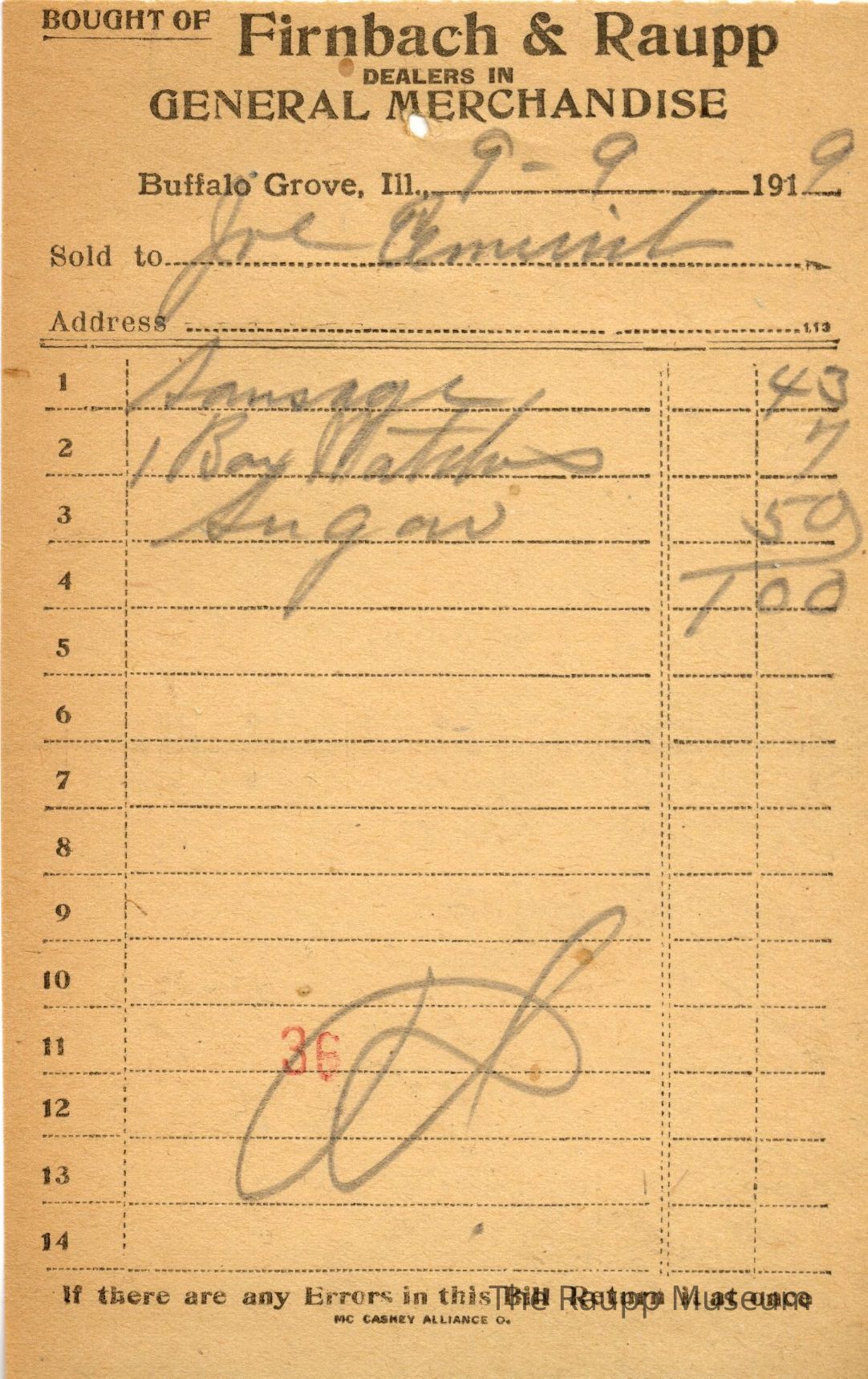 One (1) Firnbach and Raupp store receipt from September 9 1919. Receipt is for Joe Emmerich, and has 3 items purchased. Items purchased include one (1) sausage, one (1) Bay Matches, and one (1) sugar. Total is $1.00. Receipt is rectangular, with both printed and handwritten text. On the top is printed "Firnbach & Raupp Dealers In General Merchandise." PD is handwritten on the bottom, and a red 36 is stamped at the center bottom.Archive Details