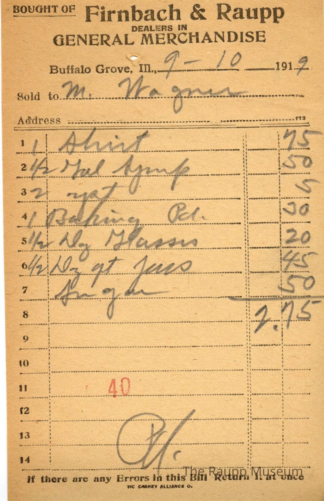 One (1) Firnbach and Raupp store receipt from September 10 1919. Receipt is M. Wagner, and has seven (7) items purchased. Purchased items include one (1) shirt, one half (1/2) gal syrup, two (2) yeast, one (1) baking powder, one half (1/2) dz glasses, one half (1/2) dz qt jars, one (1) sugar. Total is $2.75. Receipt is rectangular, with both printed and handwritten text. On the top is printed "Firnbach & Raupp Dealers In General Merchandise." PD is handwritten on the bottom, with a red 40 printed on the center bottom.Archive Details