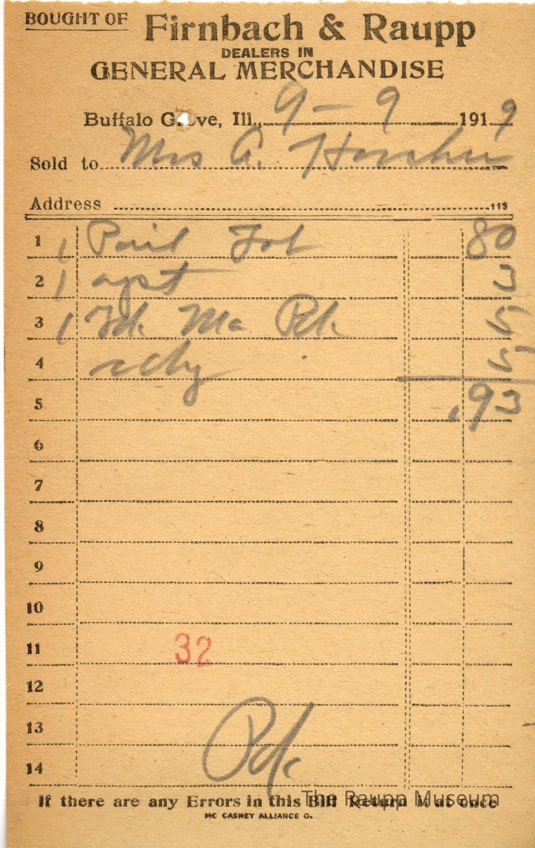One (1) Firnbach and Raupp store receipt from September 9 1919. Receipt is for Mrs. A Horcher, and has four items purchased. Purchased items include one (1) pail jar, one (1) yeast, one (1) (?), and one (?). Receipt is rectangular, with both printed and handwritten text. On the top is printed "Firnbach & Raupp Dealers In General Merchandise." PD is handwritten on the bottom, and a red 32 is stamped on the center bottom.Archive Details