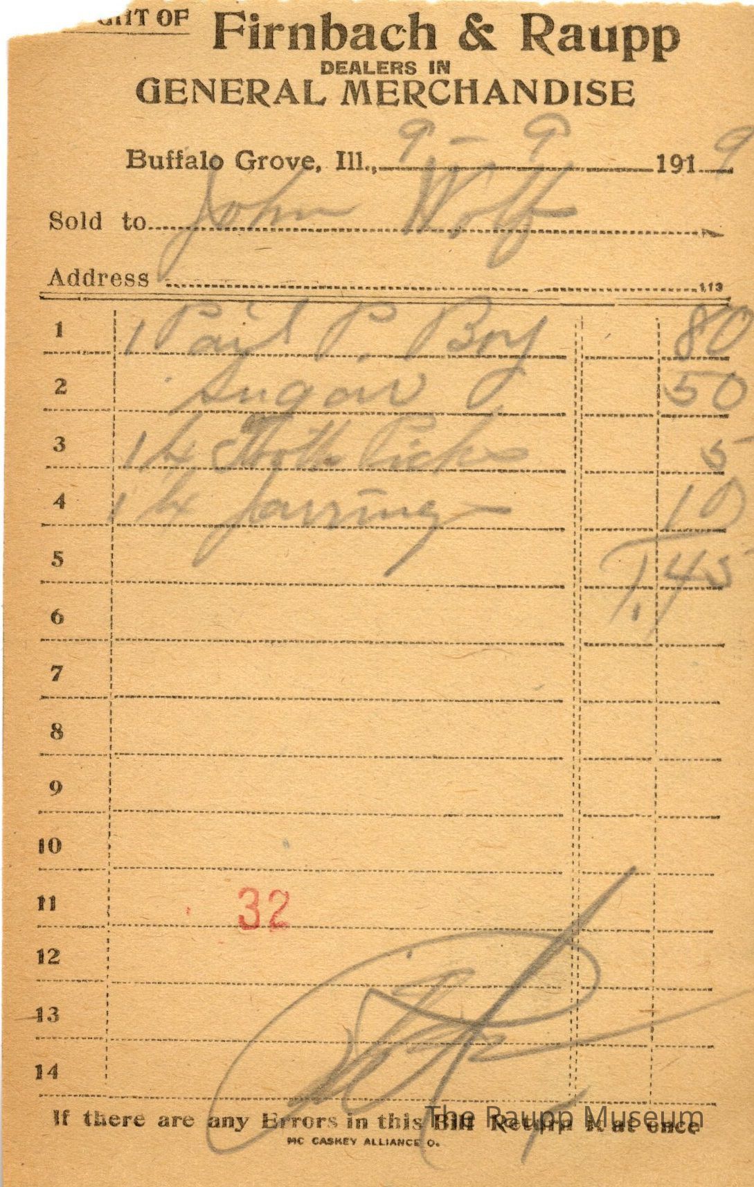 One (1) Firnbach and Raupp store receipt from September 9 1919. Receipt is for John Wolf, and has four items purchased. Purchased items include one (1) Pail P. Boy, one (1) sugar, one (1) dz tooth picks, and one dz jarrings. Total is $1.45. Receipt is rectangular, with both printed and handwritten text. On the top is printed "Firnbach & Raupp Dealers In General Merchandise." PD is handwritten on the bottom, with a red 32 stamped in the center bottom.Archive Details