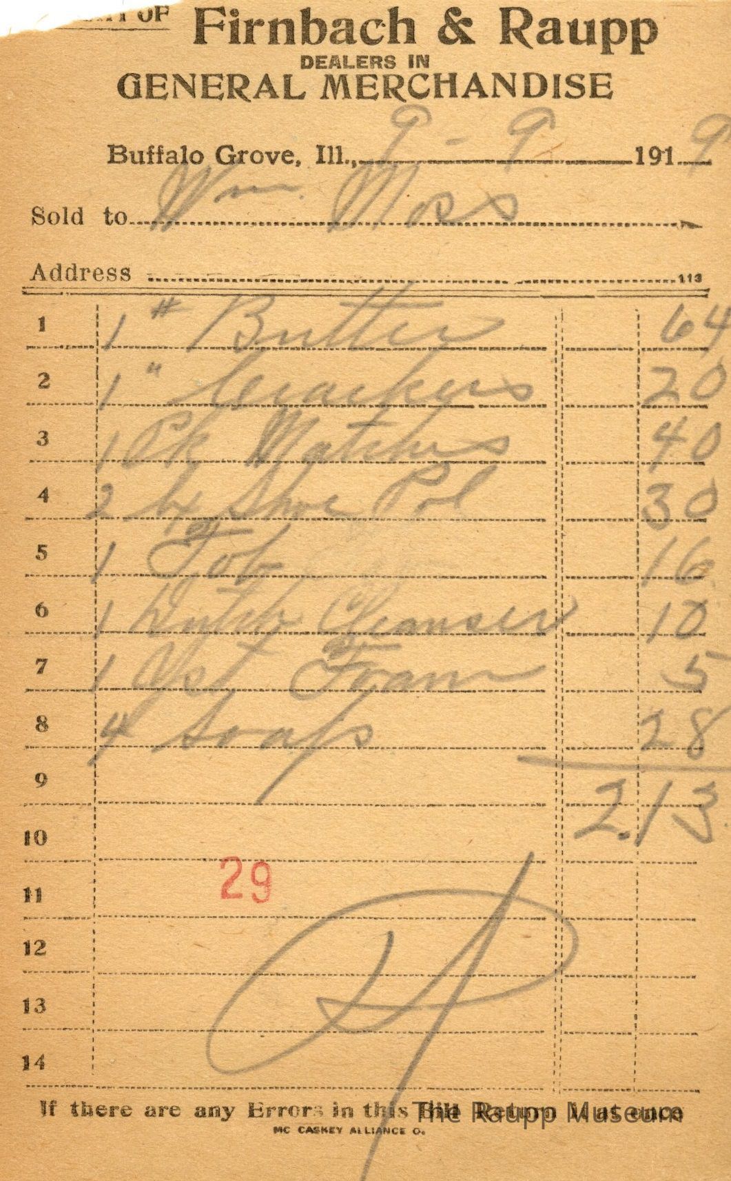 One (1) Firnbach and Raupp store receipt from September 9 1919. Receipt is for W Mies (?), and has eight (8) items purchased. Receipt is one of two from the same customer in the same day. Purchased items include one (1) # butter, one (1) # crackers, one (1) CK Matches, one two (2) dz shoe pad (?), one (1) jar, one (1) watch cleanser, one (1) yeast foam, four (4) scraps (?). Total is $2.13. Receipt is rectangular, with both printed and handwritten text. On the top is printed "Firnbach & Raupp Dealers In General Merchandise." PD is handwritten on the bottom, with a red 29 stamped in the center bottom.Archive Details