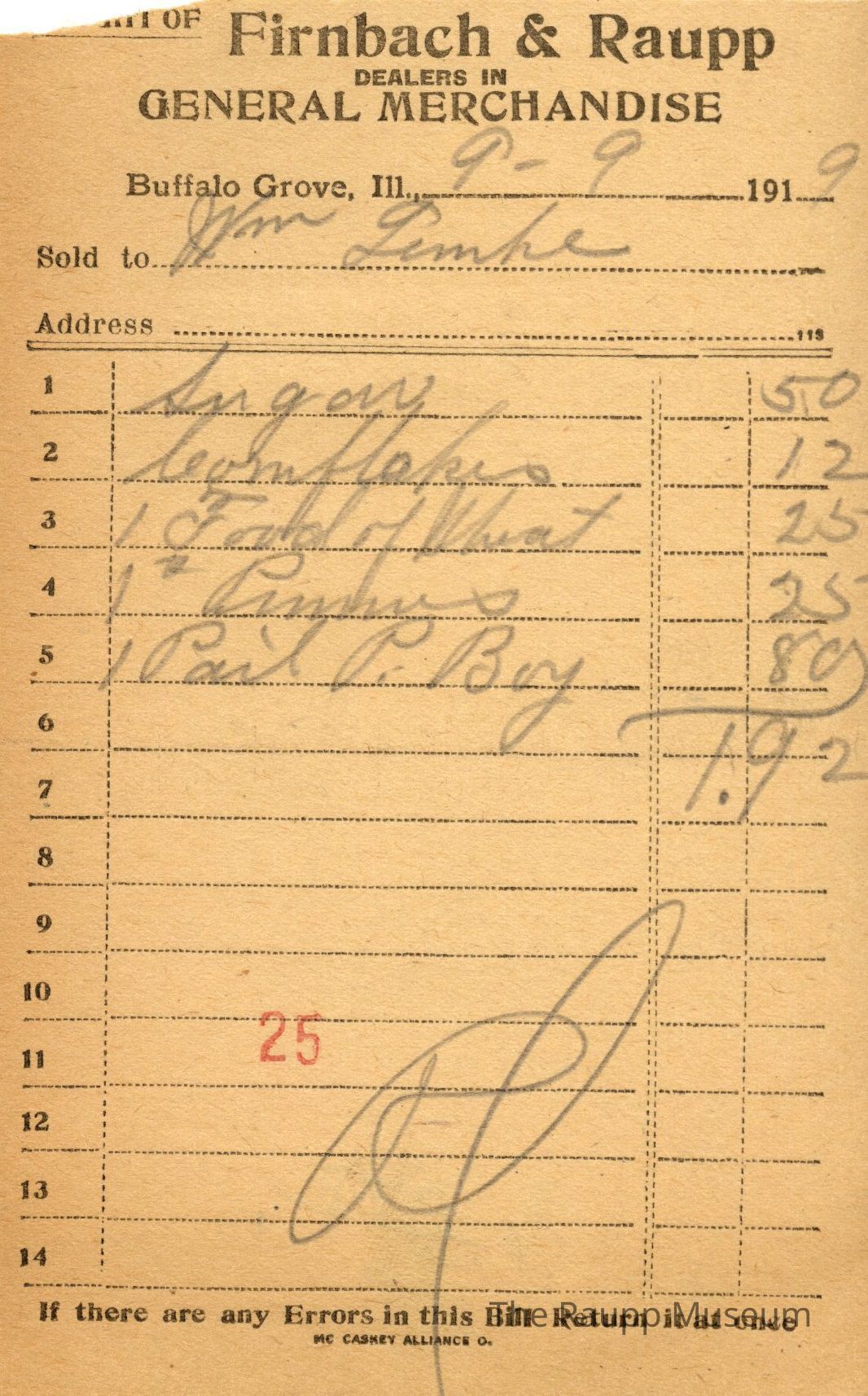 One (1) Firnbach and Raupp store receipt from September 9 1919. Receipt is for William Lemke, and has five (5) items purchased. Purchased items include one (1) sugar, one (1) corn flakes, one (1) jourd of wheat (?), one (1) # prunes, and one (1) Pail P. Boy. Total is $1.92. Receipt is rectangular, with both printed and handwritten text. On the top is printed "Firnbach & Raupp Dealers In General Merchandise." PD is handwritten on the bottom, with a red 25 stamped in the center bottom. Math markings are handwritten on the back.Archive Details