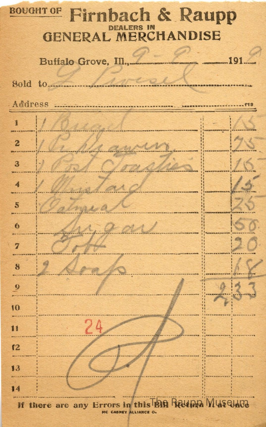 One (1) Firnbach and Raupp store receipt from September 9 1919. Receipt is for G Puresel, and has eight (8) items purchased. Purchased items include one (1) bread, one (1) (?), one (1) Post Toasties, one (1) mustard, one (1) oatmeal, one (1) sugar, one (1) tof, and two (2) soap. Total is $2.33. Receipt is rectangular, with both printed and handwritten text. On the top is printed "Firnbach & Raupp Dealers In General Merchandise." PD is handwritten on the bottom, with a red 24 stamped in the center bottom.Archive Details