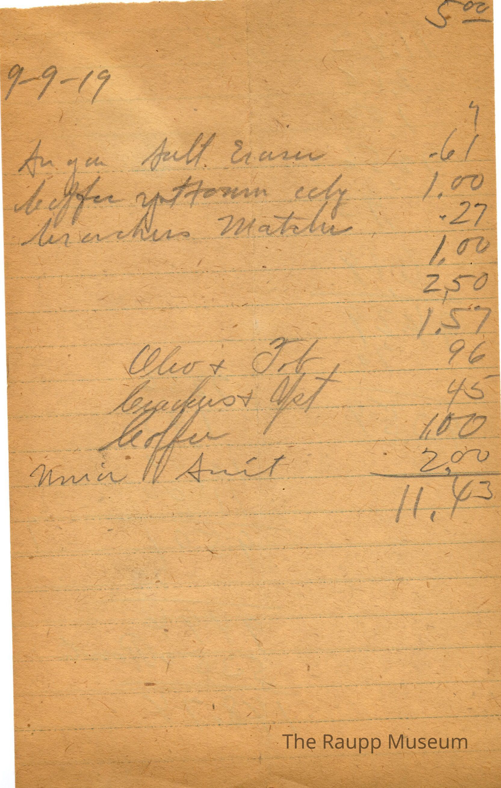 One (1) Firnbach and Raupp store receipt from September 9 1919. Receipt is for an unnamed customer, and has fifteen (15) items purchased. Purchased items do not have quantities, but include sugar, salt, eraser, coffee, (?), (?), (?), matches, Oleo, (?), (?), yet (?), coffee, (?), (?). Total is $11.43, and $1.32 after credit. Receipt is rectangular, with only handwritten text. The backside is full of math markings, with totals of $95.59 and $148.74 evident.Archive Details