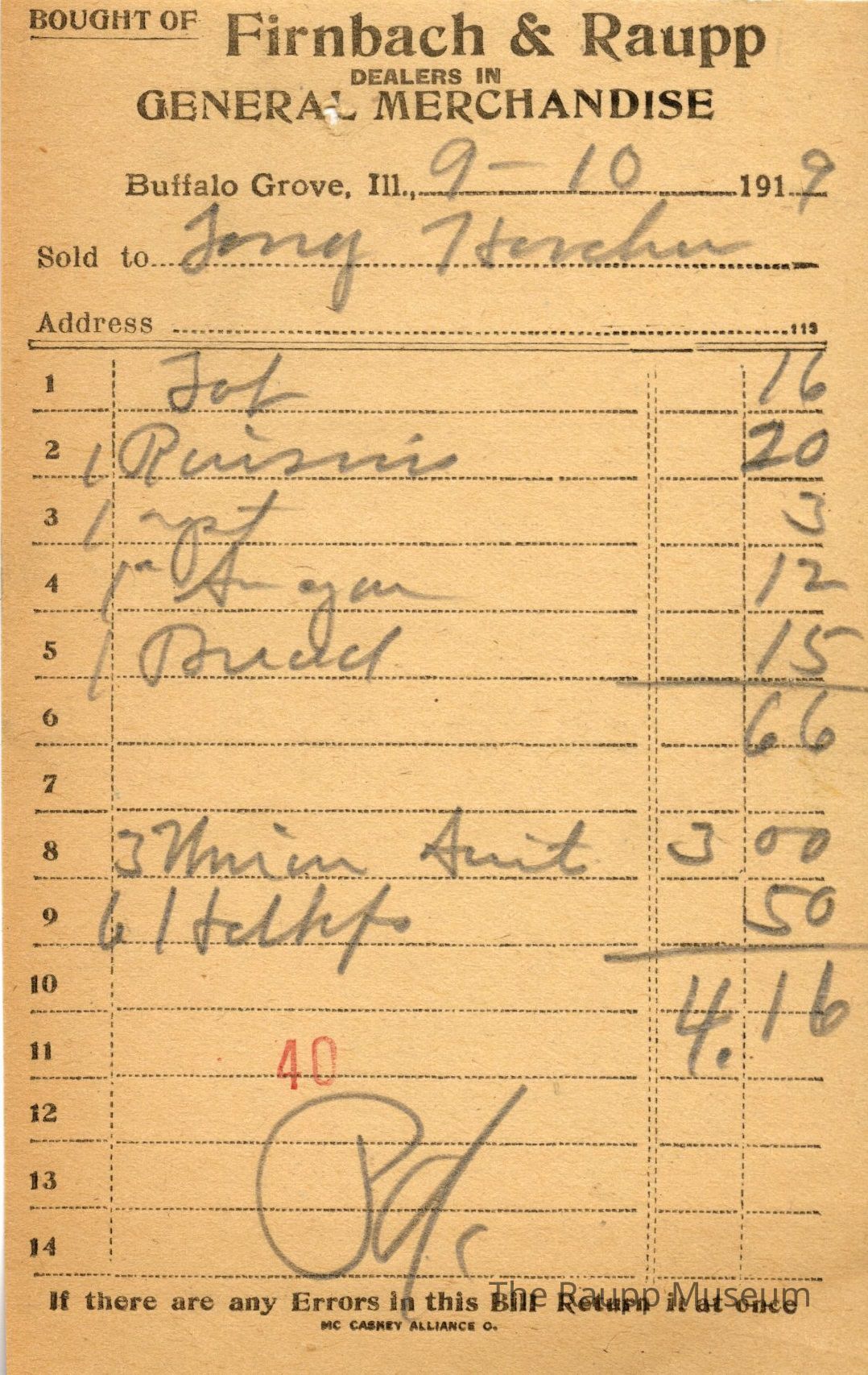 One (1) Firnbach and Raupp store receipt from September 9 1919. Receipt is for Tony Horcher, and has seven (7) items purchased. Purchased items include one (1) (?), one (1) raisins, one (1) apt, one (1) sugar, one (1) bread, three (?), and six (6) (?). Total is $4.16. Receipt is rectangular, with both printed and handwritten text. On the top is printed "Firnbach & Raupp Dealers In General Merchandise." PD is handwritten on the bottom, and a red 40 is stamped on the center bottom.Archive Details