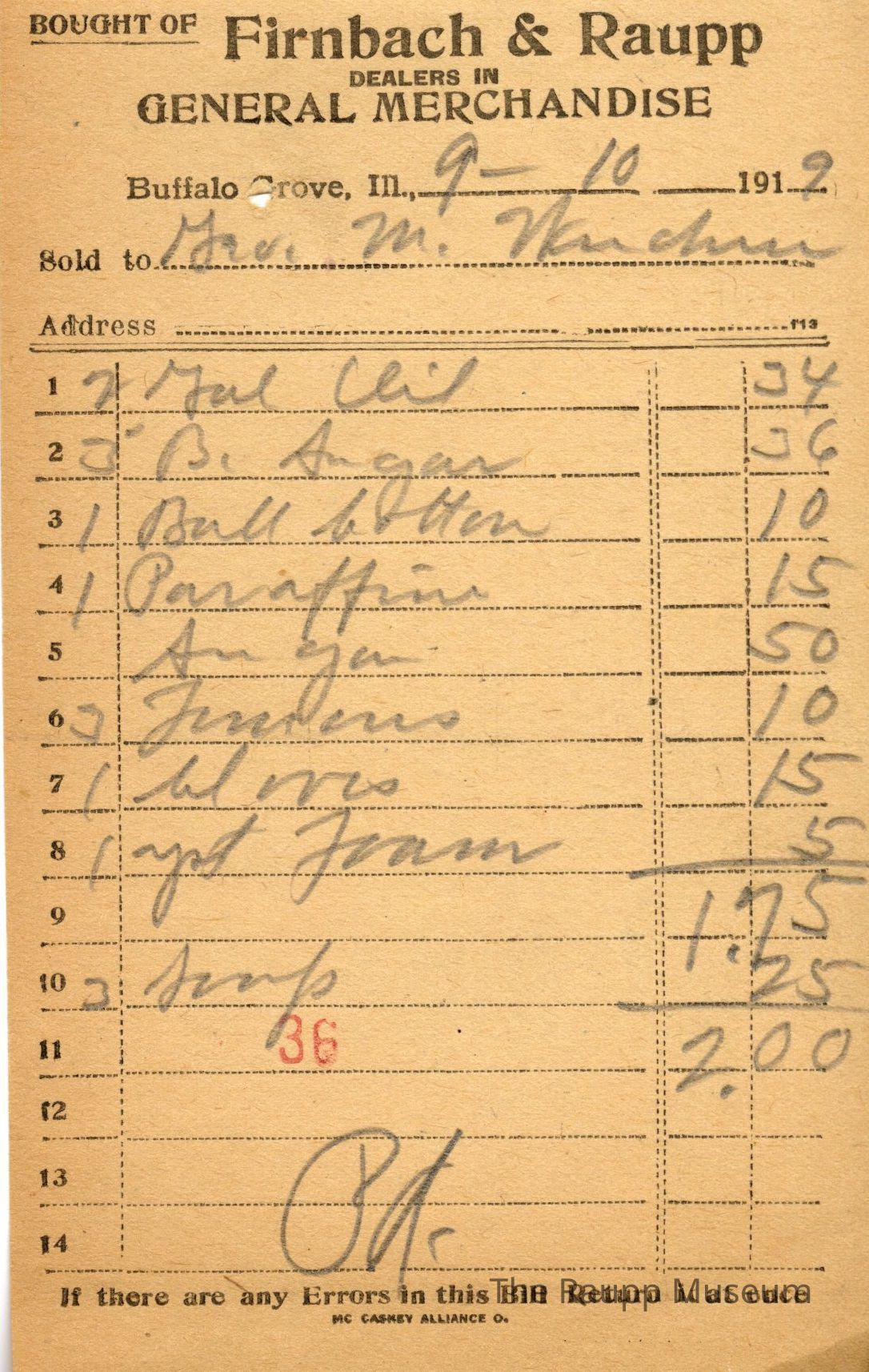 One (1) Firnbach and Raupp store receipt from September 10 1919. Receipt is for Geo M. Weidner, and has nine (9) items purchased. Purchased items include two (2) gal coil (?), three (3) b. sugar, one (1) ball cotton, one (1) panattine (?), one (1) sugar, three (3) (?), one (1) gloves, one (1) yeast foam, three (3) scrap. Total is $2.00. Receipt is rectangular, with both printed and handwritten text. On the top is printed "Firnbach & Raupp Dealers In General Merchandise." PD is handwritten on the bottom, and a red 36 is stamped on the center bottom.Archive Details