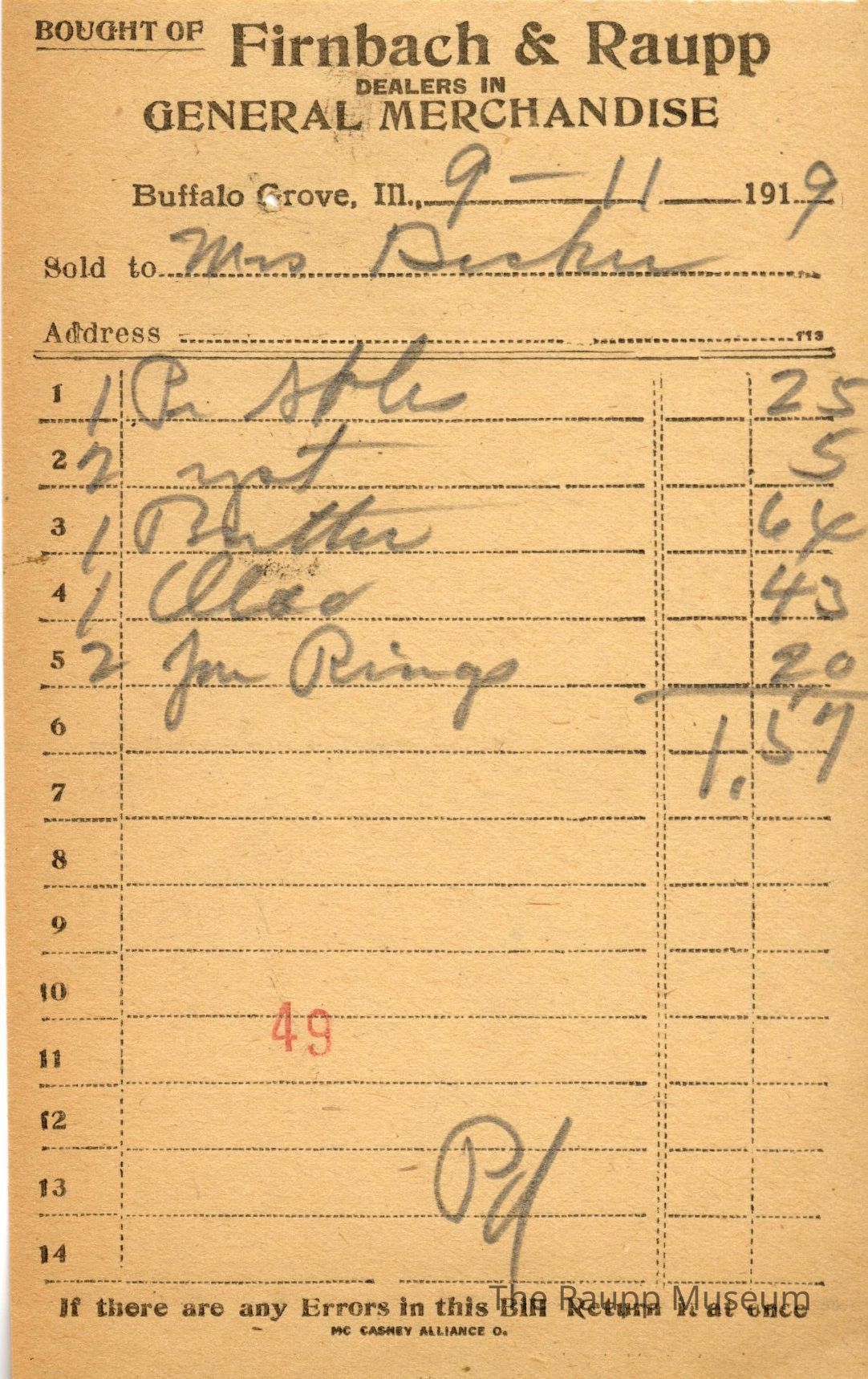 One (1) Firnbach and Raupp store receipt from September 11 1919. Receipt is for Mrs Becker, and has five (5) items purchased. Purchased items include one (1) pair shoes, two (2) yeast, one (1) butter, one (1) oleo, and two (2) jar rings. Total is $1.59. Receipt is rectangular, with both printed and handwritten text. On the top is printed "Firnbach & Raupp Dealers In General Merchandise." PD is handwritten on the bottom, and a red 49 is stamped on the center bottom.Archive Details