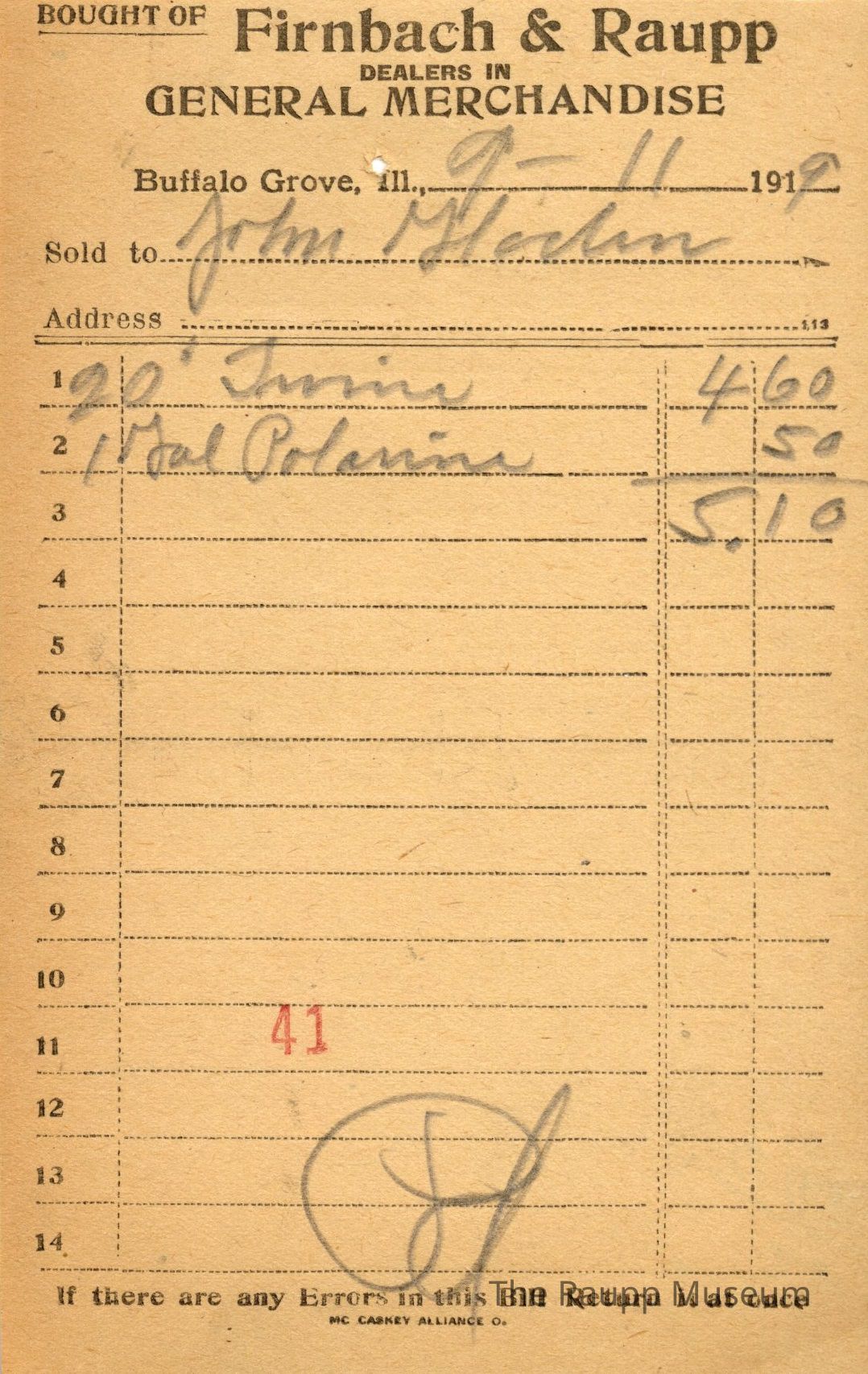 One (1) Firnbach and Raupp store receipt from September 11 1919. Receipt is for John Gloden, and has two (2) items purchased. Purchased items include twenty (20) # twine and one (1) gal polamine (?). Total is $5.10. Receipt is rectangular, with both printed and handwritten text. On the top is printed "Firnbach & Raupp Dealers In General Merchandise." PD is handwritten on the bottom, and a red 41 is stamped on the center bottom. Math markings are evident on the back.Archive Details