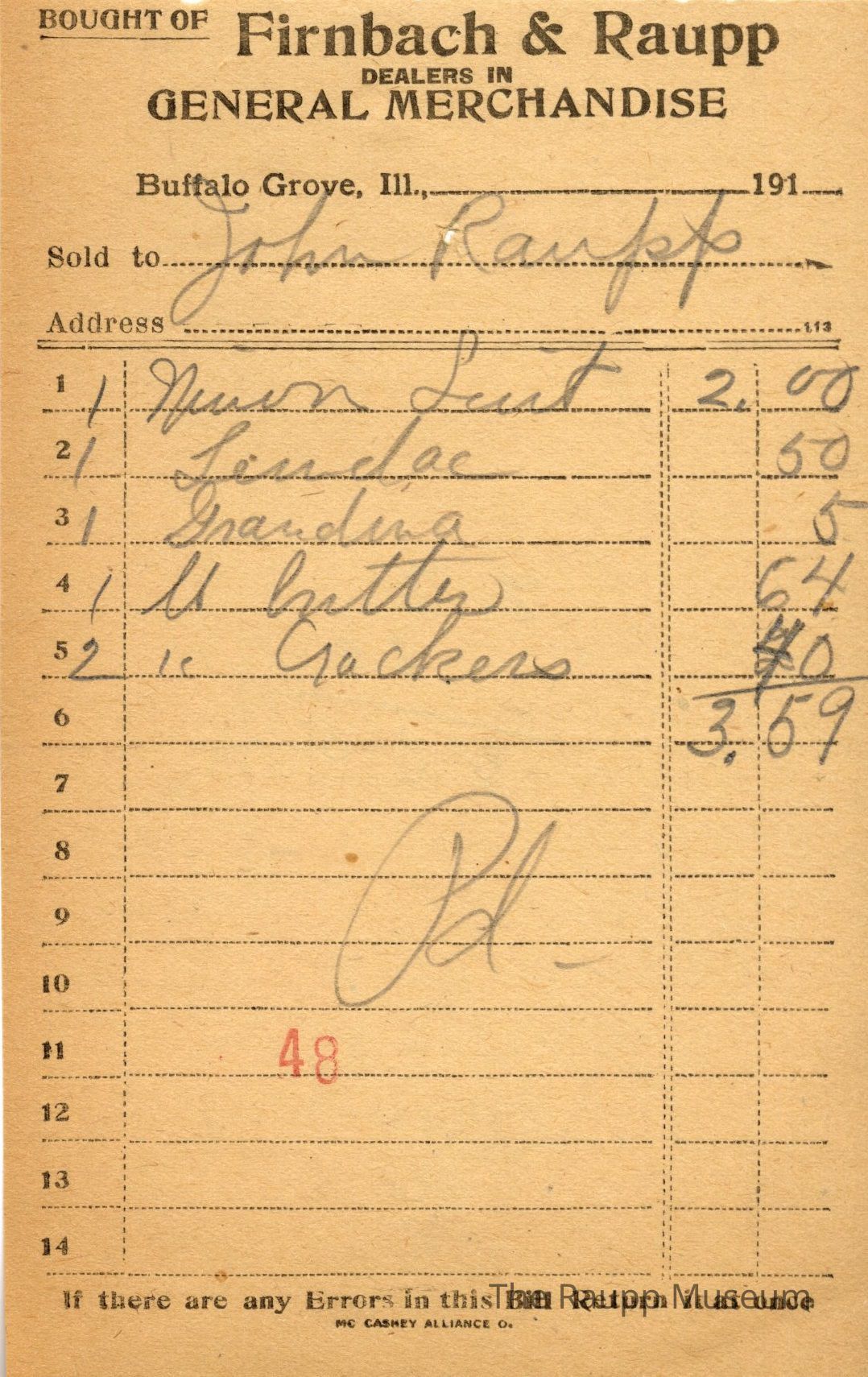 One (1) Firnbach and Raupp store receipt from September 11 1919 (no date listed but found in same collection). Receipt is for John Raupp, and has five (5) items purchased. Purchased items include one (1) (?), one (1) (?), one (1) (?), one (1) butter, and two (2) " crackers. Receipt is rectangular, with both printed and handwritten text. On the top is printed "Firnbach & Raupp Dealers In General Merchandise." PD is handwritten on the bottom, and a red 48 is stamped on the center bottom. Math markings are evident on the back.Archive Details