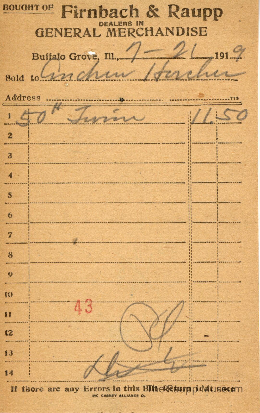 One (1) Firnbach and Raupp store receipt from July 21 1919. Receipt is for Andrew Horcher, and has one (1) item purchased. Purchased item is fifty (50) # twine. Total is $11.50. Receipt is rectangular, with both printed and handwritten text. On the top is printed "Firnbach & Raupp Dealers In General Merchandise." PD is handwritten on the bottom, and a red 43 is stamped on the center bottom. Math markings are evident on the back.Archive Details