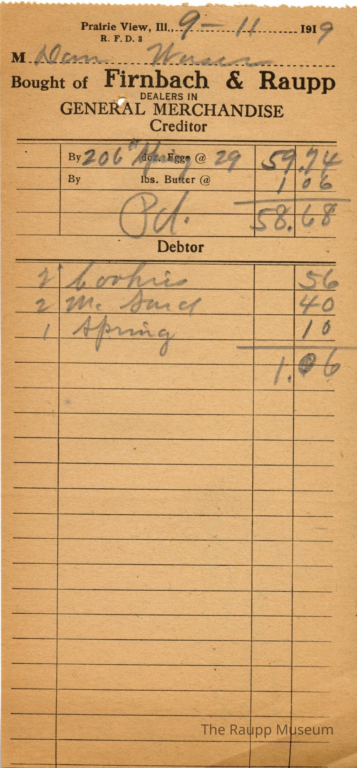 One (1) Firnbach and Raupp store receipt from September 11 1919. Receipt is for Waser (?), and has three (3) items purchased, as well as credit for two hundred six (206) pounds of springs (?) at $.29 per pound, totaling $59.94. Purchased items include two (2) cookies, two (2) (?), and one (1) spring. Total is $1.06. Receipt is rectangular, with both printed and handwritten text. On the top is printed "Firnbach & Raupp Dealers In General Merchandise." PD is handwritten on the bottom. Math markings are evident on the back.Archive Details