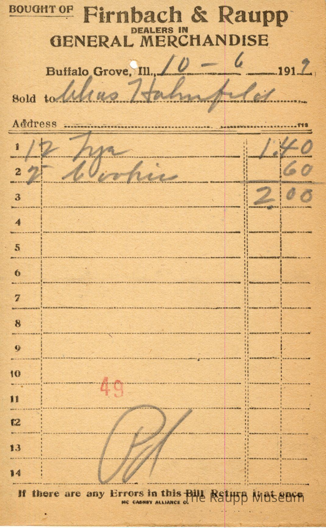 One (1) Firnbach and Raupp store receipt from October 6, 1919. Receipt is rectangular with black printed text and written notes in pencil. The receipt is for Chas Hahnfeld, who bought twelve Tya (?) for $1.40 and two pounds of cookies for $0.60. The bill total is $2.00 and the receipt is marked as paid. A red stamp of 49 is located towards the bottom of the page. The text from top to bottom is: BOUGHT OF Firnbach & Raupp; DEALERS IN GENERAL MERCHANDISE; Buffalo Grove, Ill.; Sold to; Address; If there are any Errors in this Bill Return It at once; MC CASKEY ALLIANCE O.Archive Details