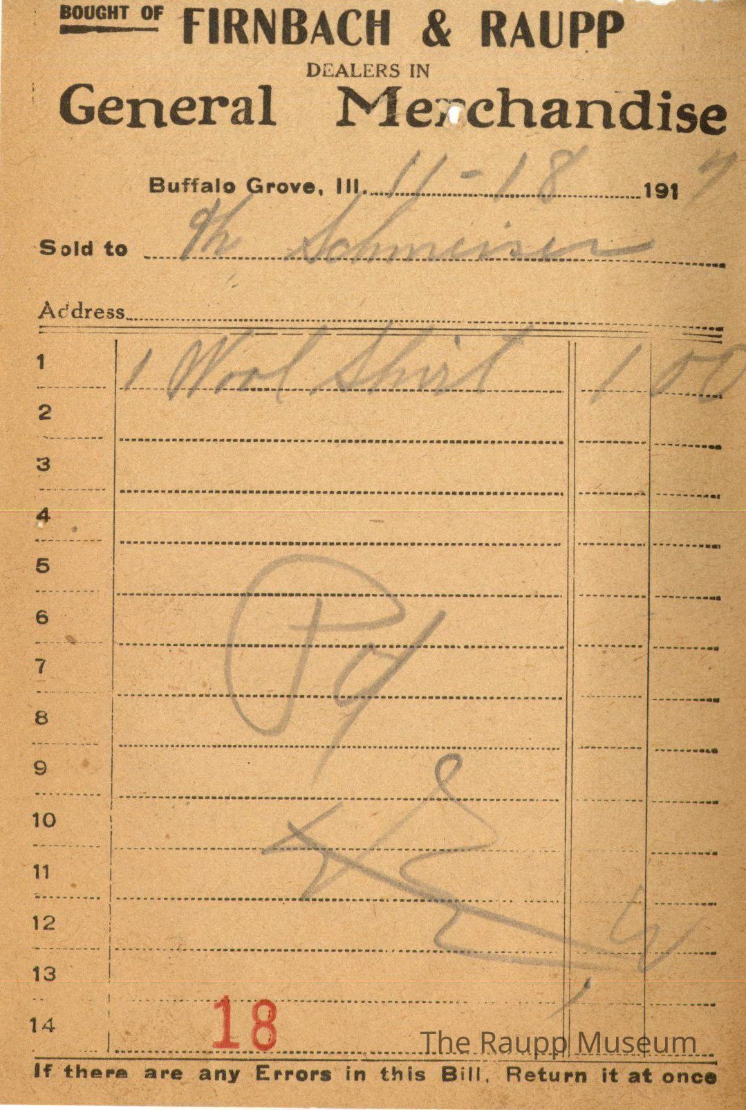 The black text is as follows, from top to bottom: "Bought of FIRNBACH & RAUPP: Dealers in General Merchandise; Buffalo Grove , Ill.; Sold to; Address; If there are any Errors in this Bill, Return it at once;"Archive Details