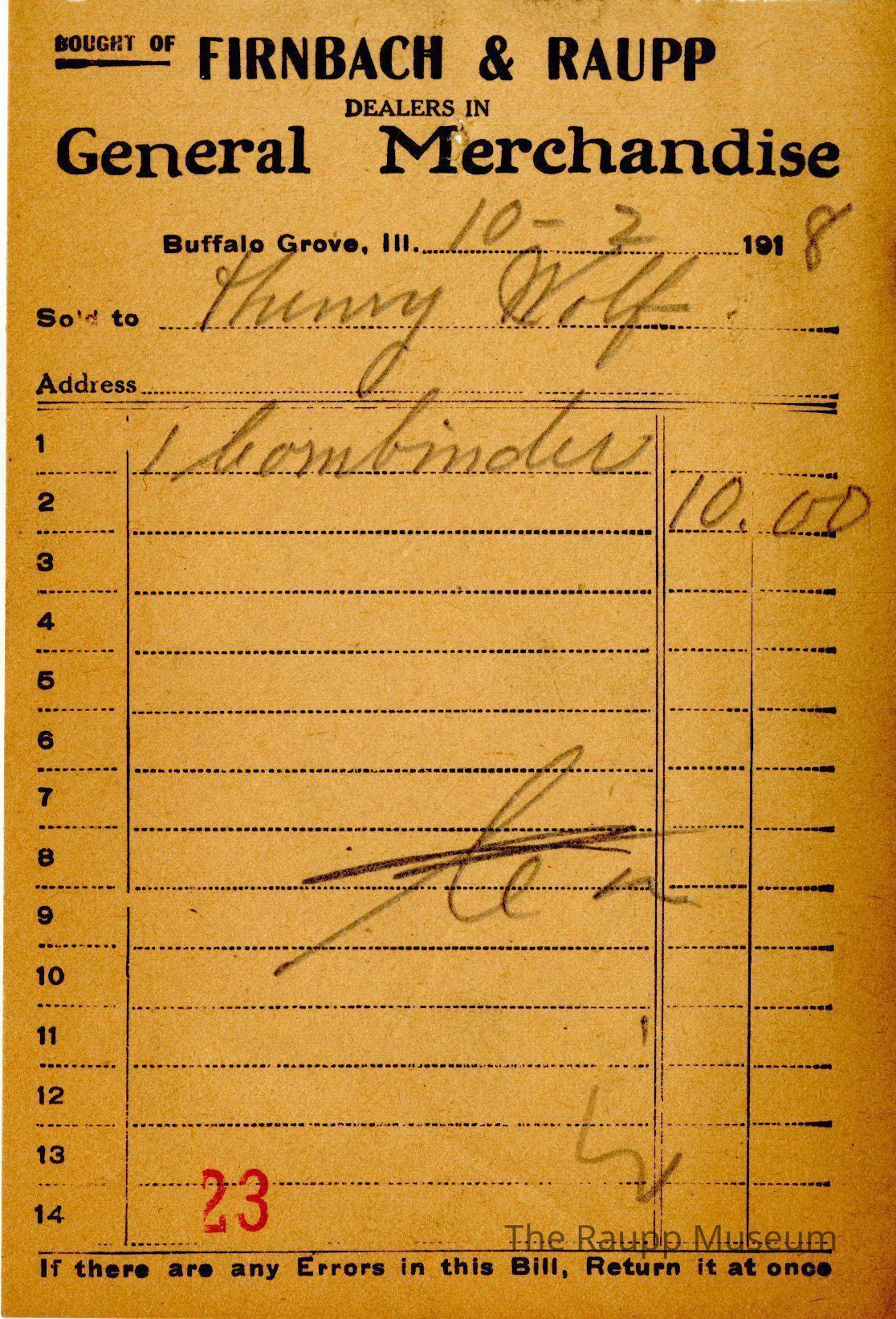 One (1) Firnbach and Raupp store receipt from October 2nd, 1918. Receipt is rectangular with black printed text and handwritten notes in pencil. The receipt is for Henry Wolf, who bought 1 Corn binder for $10.00. Bill total was $10.00 and is marked as paid. There is a red stamp of 23 close to the bottom.