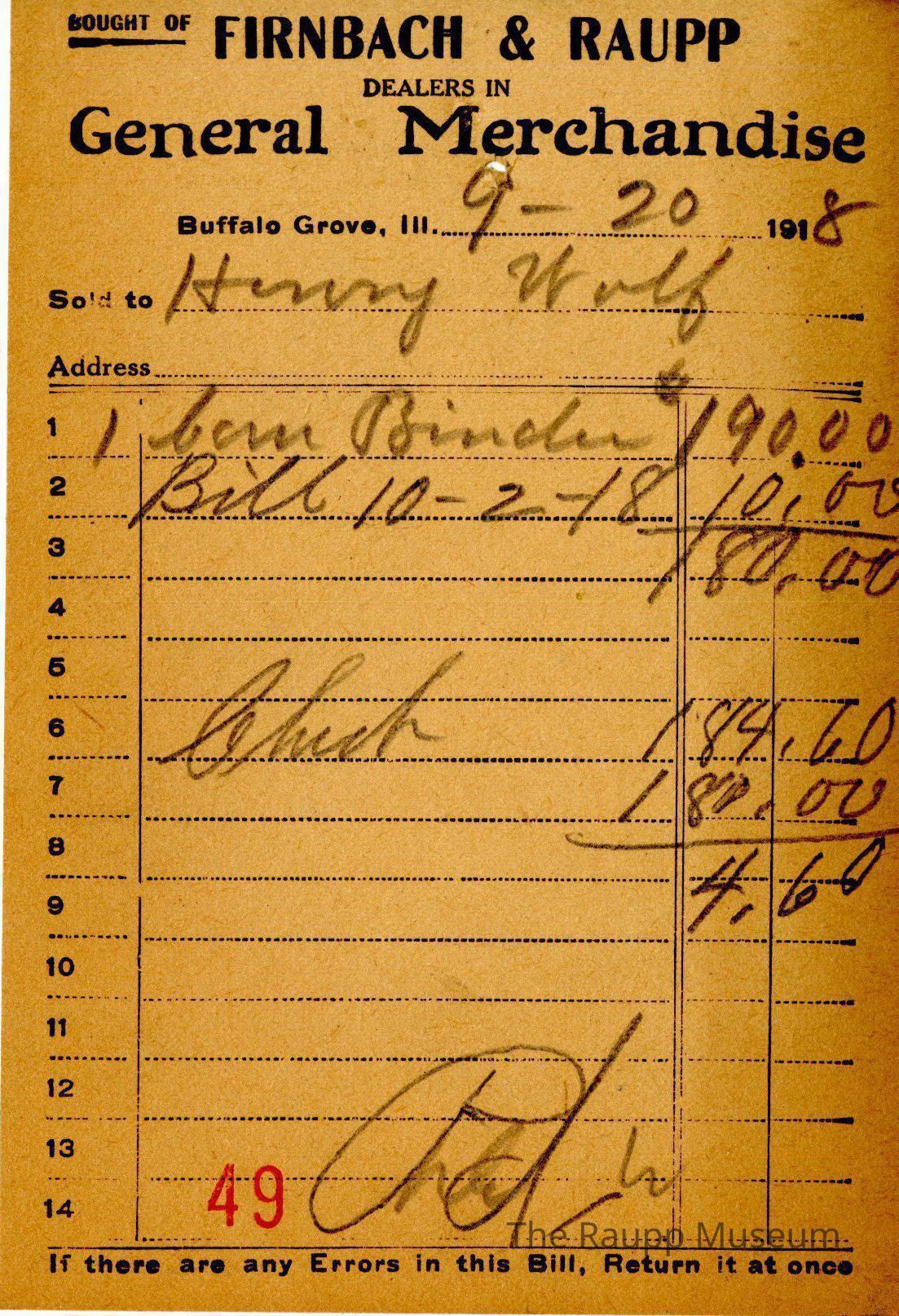 One (1) Firnbach and Raupp store receipt from September 20th, 1918. Receipt is rectangular with black printed text and handwritten notes in pencil. The receipt is for Henry Wolf, who bought 1 Corn binder for $190.00. He also had a past bill of $10.00, subtracting that that the cost amounts to $180.00. He then sold a chaf(?) for $184.60, so subtracting the previous cost from the sold cost, his bill total amounts to $4.60 and is marked as paid. There is a red stamp of 49 close to the bottom.
