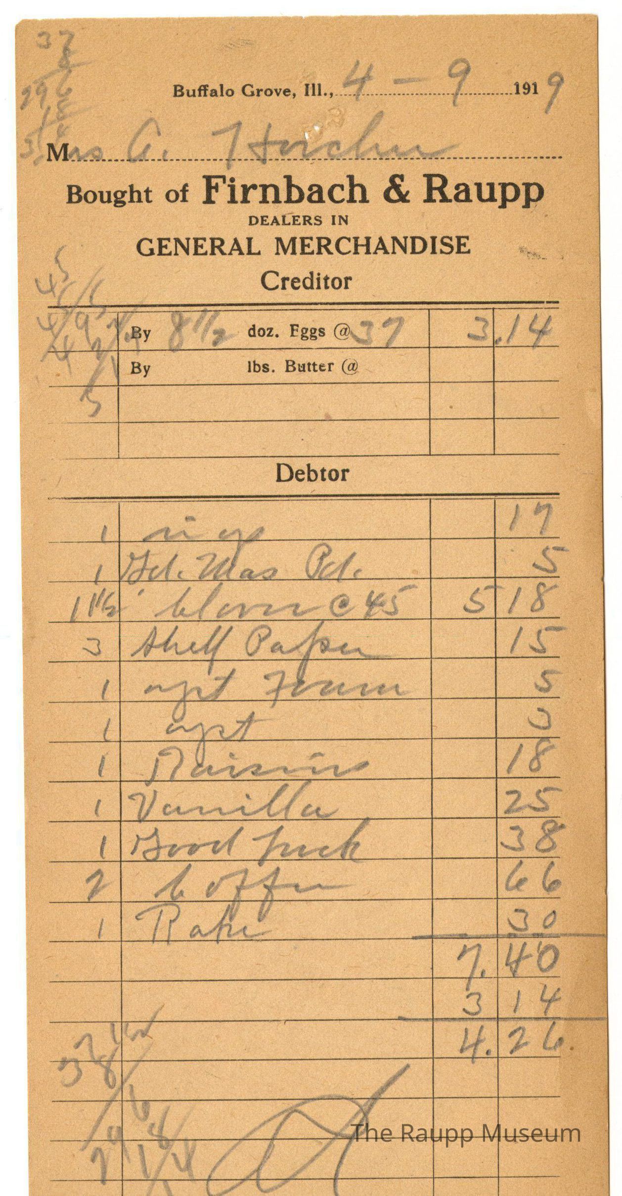 The black text is as follows, from top to bottom: Buffalo Grove, Ill. ; Bought of Firnbach and Raupp: Dealers in GENERAL MERCHANDISE; Creditor; By, doz. Eggs @; By, lbs. Butter @; Debtor"Archive Details