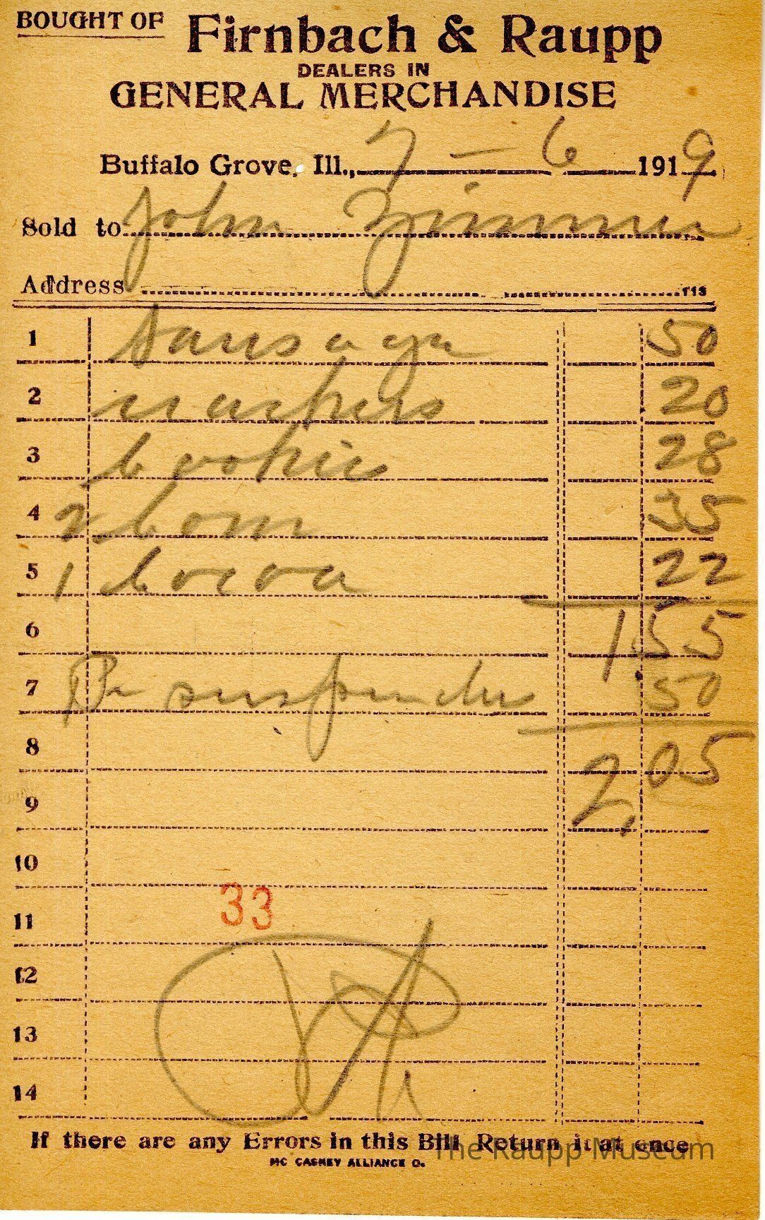 The black text is as follows, from top to bottom bought of Firnback & Raupp; Dealers in General Merchandise; Buffalo Grove, Ill.; Sold to; Address; If there are any Errors in this Bill Return it at once; MC CASKEY ALLIANCE O.Archive Details