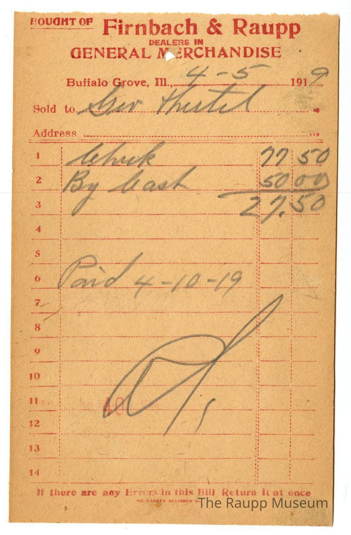 One (1) Firnbach and Raupp store receipt from April 5, 1919. Receipt is rectangular with red printed text and handwritten notes in pencil. The receipt is for Geo Hertel who bought Chicks(?) for $77.50. Bill total was $77.50 but $50.00 was paid by cash making the new total $27.50. The bill was paid April 10, 1919 and is marked as paid. There is a red stamp of 40 close to the bottom.