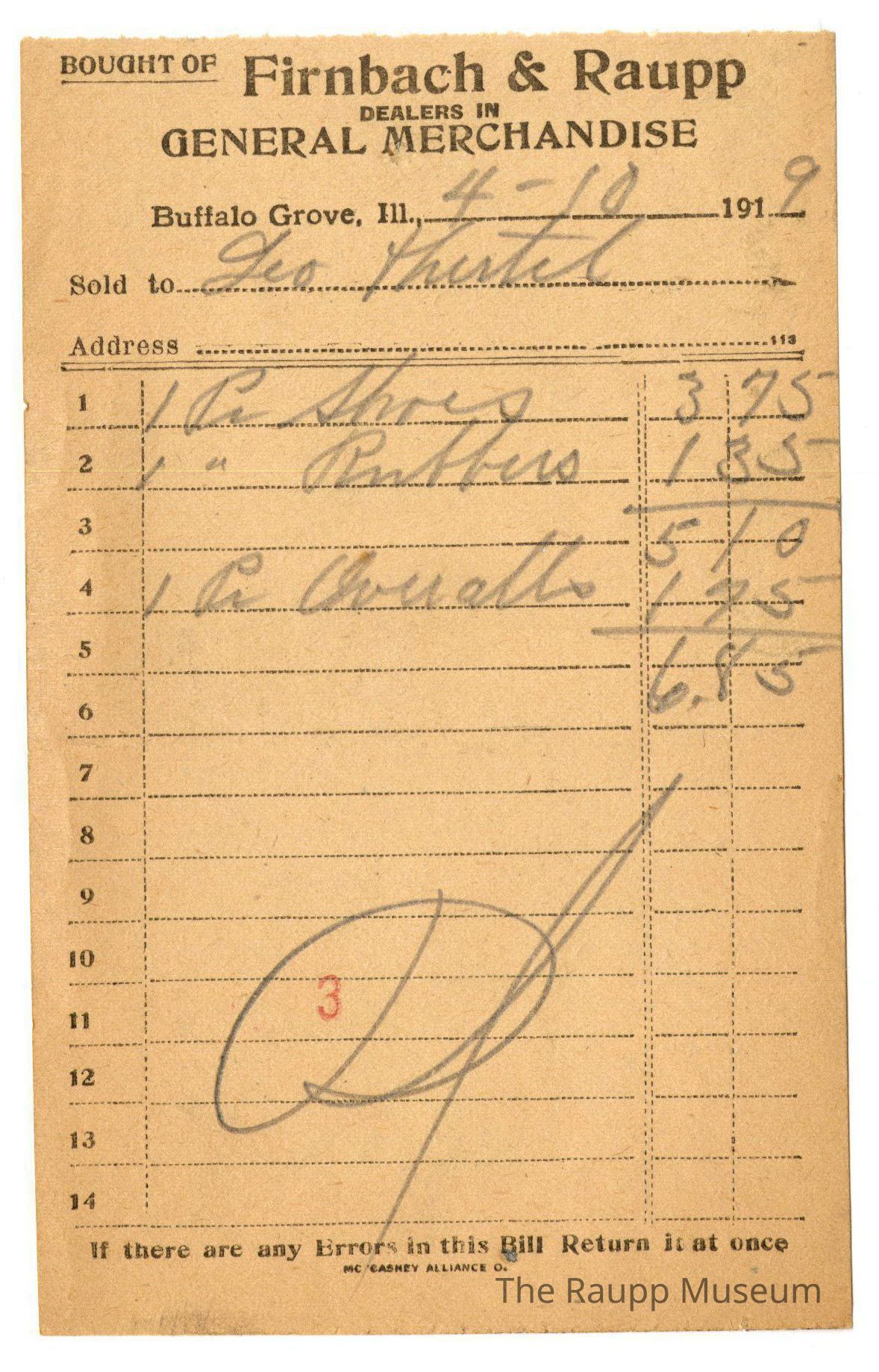 The black text is as follows, from top to bottom: "Bought of Firnbach and Raupp: Dealers in GENERAL MERCHANDISE; Buffalo Grove , Ill.; Sold to; Address; If there are any Errors in this Bill Return it at once; MC CARNEY ALLIANCE O."Archive Details