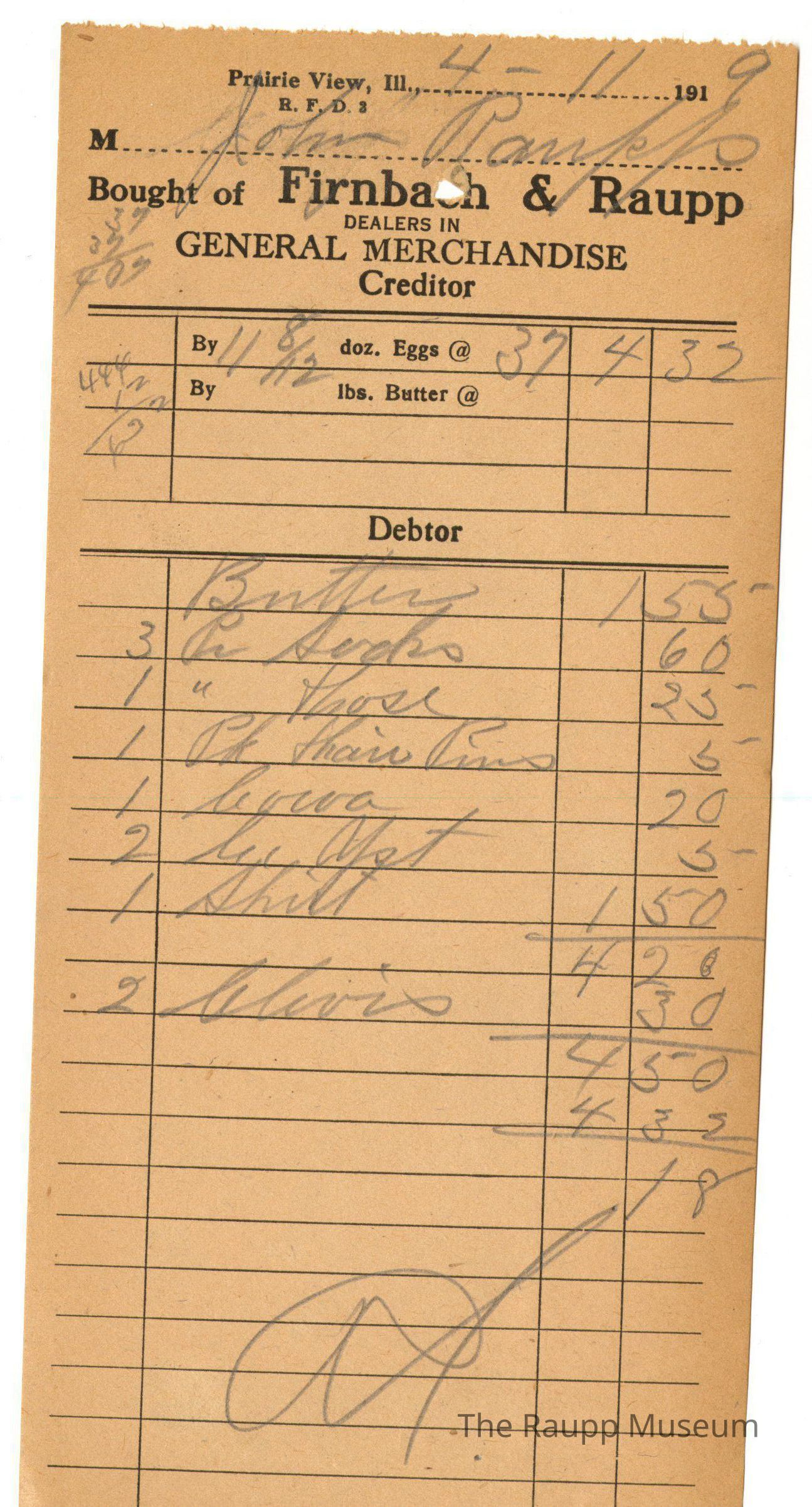The black text is as follows, from top to bottom: Prairie View, Ill. ; Bought of Firnbach and Raupp: Dealers in GENERAL MERCHANDISE; Creditor; By, doz. Eggs @; By, lbs. Butter @; Debtor"Archive Details