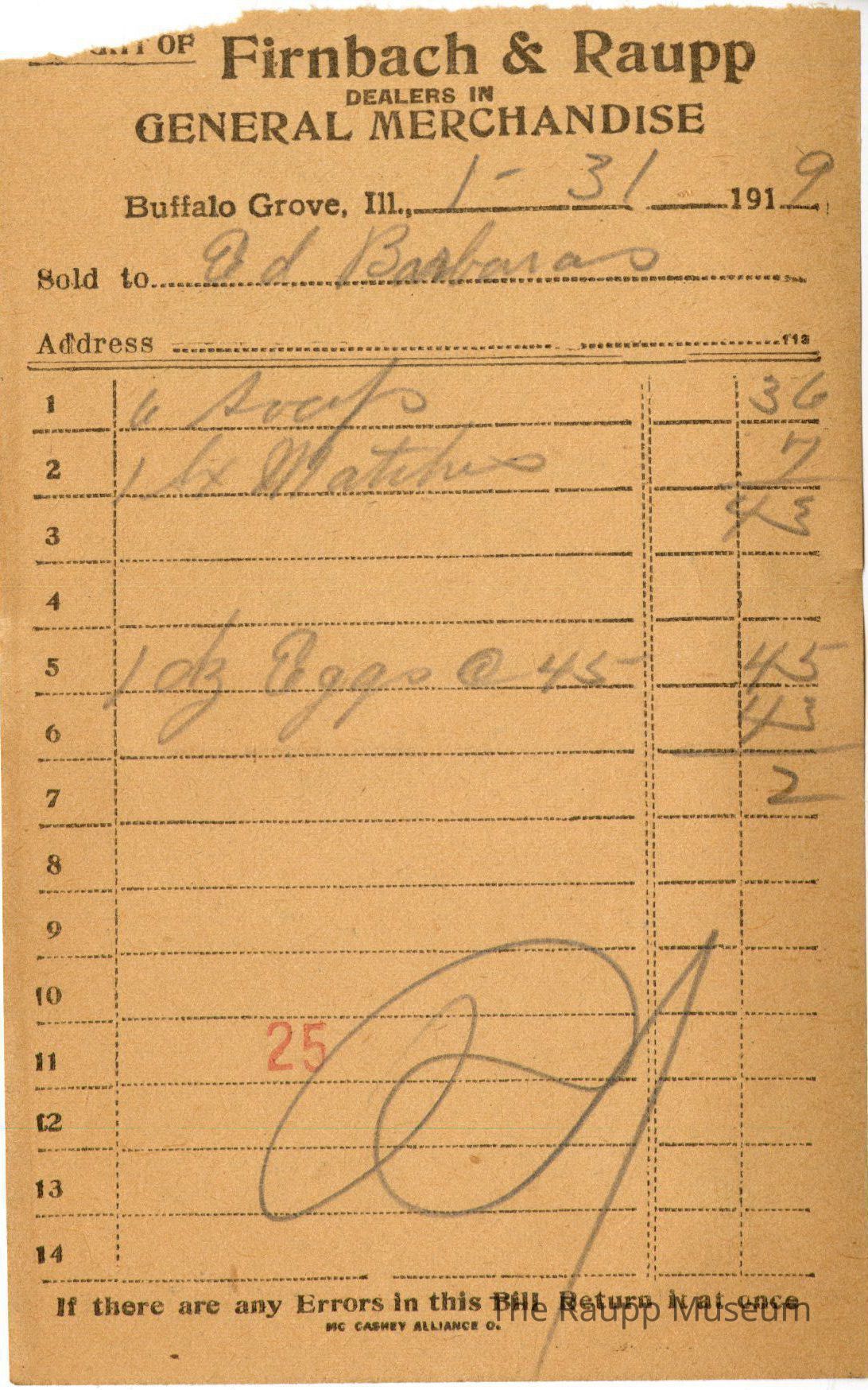 One (1) Firnbach and Raupp store receipt from January 31st ,1919. Receipt is rectangular with black printed text and handwritten notes in pencil. Receipt is for Edward Barbaras (?) who bought 1 soap for $0.36,1 pack of matches for $0.07, 1 dozen of eggs for $0.45. The bill total was $0.02. They paid $0.02 by cash. The bill was marked as paid. There is a red stamp of "25".